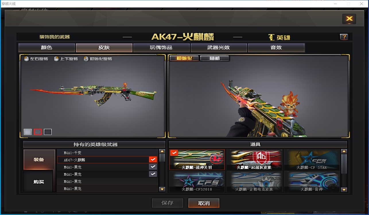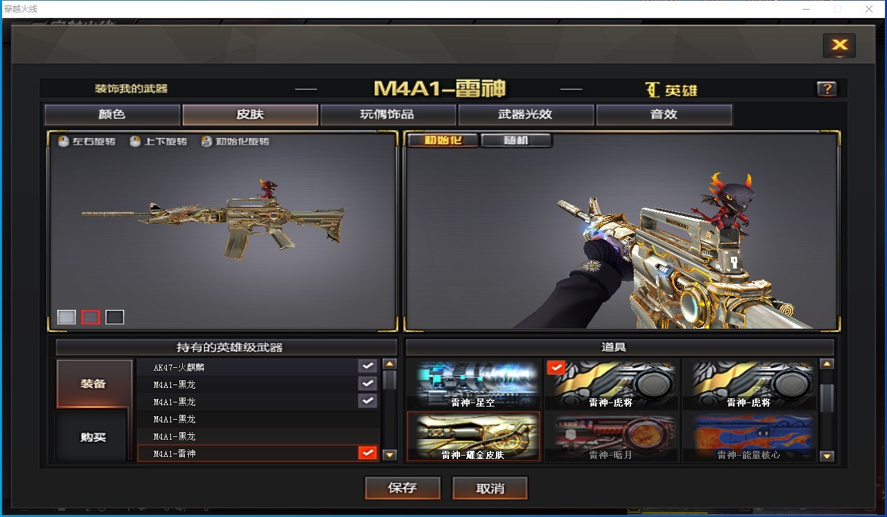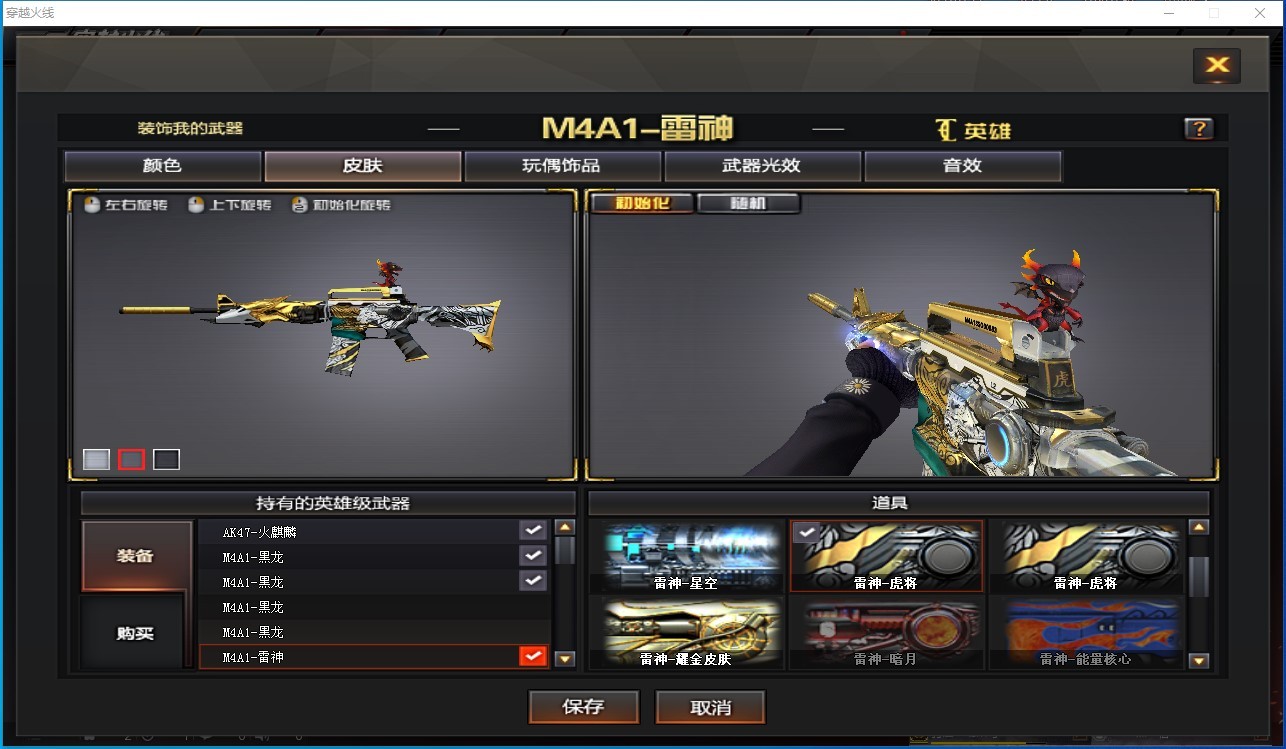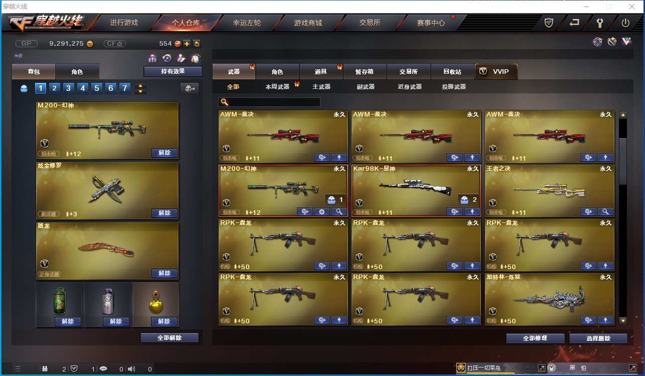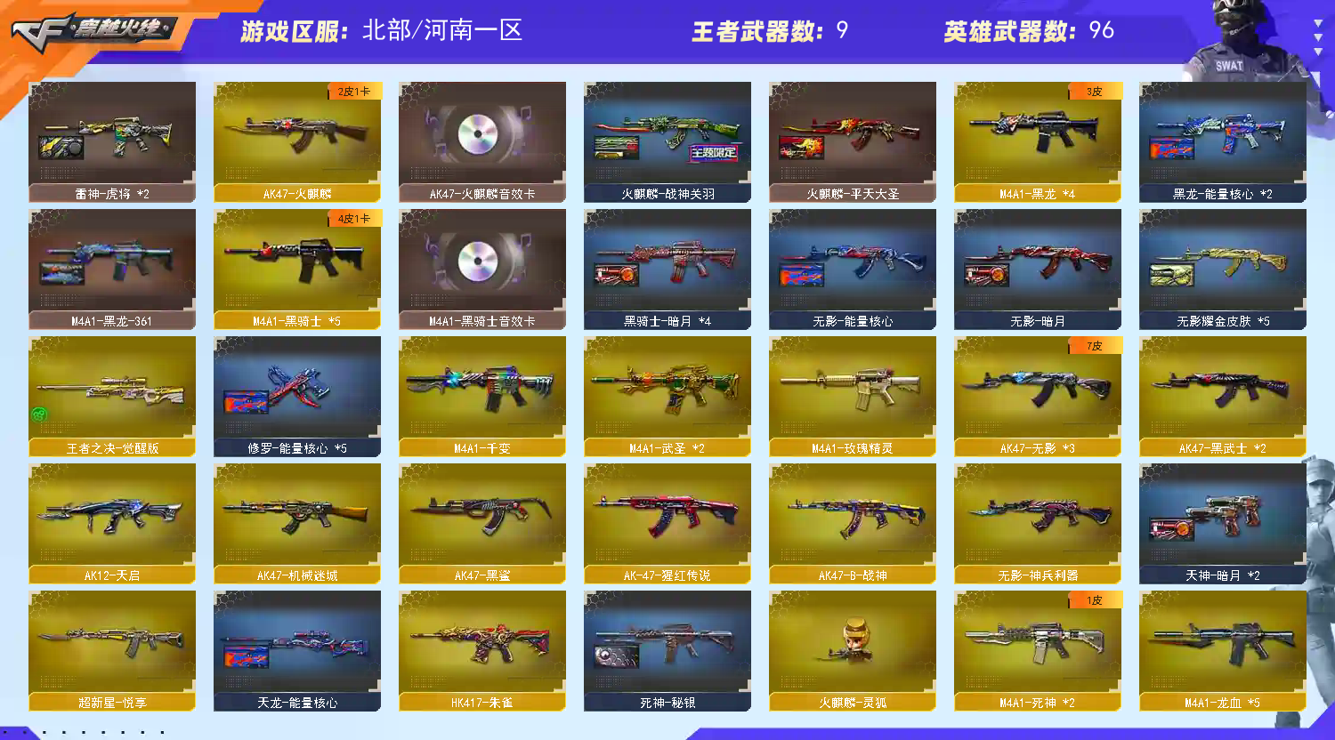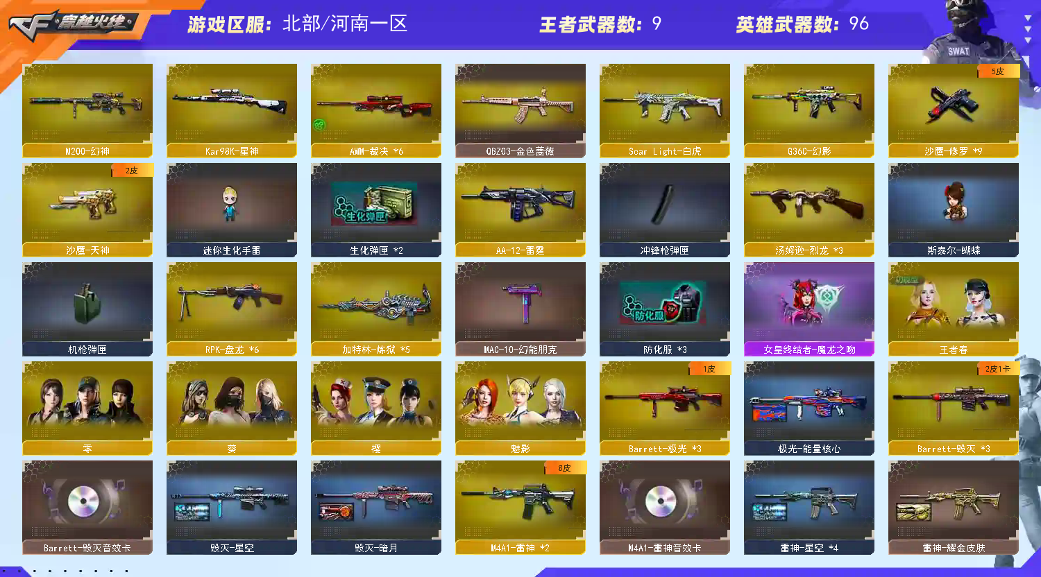 【主武】斯泰尔蝴蝶、王者之戮、王者之势、王者之决、炫金雷神X7、炫金毁灭X2、炫金天龙、星神98K、M4A1-千变、AK47-火麒麟、M4A1-黑龙X4、M4A1-雷神X2、M4A1-黑骑士X5、AK47-无影X3、M4A1-死神、AK47-黑武士X2、AK12-天启、M4A1-武圣X2、AK47-机械迷城、AK47-黑鲨、M4A1-龙血X2、HK417-朱雀、Scar-白虎、M4A1-玫瑰精灵、QBZ03-金色蔷薇、9A91-烈火X6、AWM-天龙X4、Barrett-毁灭X2、Barrett-极光X3、AWM-裁决X7、M200-幻神、RPK-盘龙X5、加特林-炼狱X5、汤姆逊-烈龙X6、AA-12-雷霆、火麒麟-灵狐