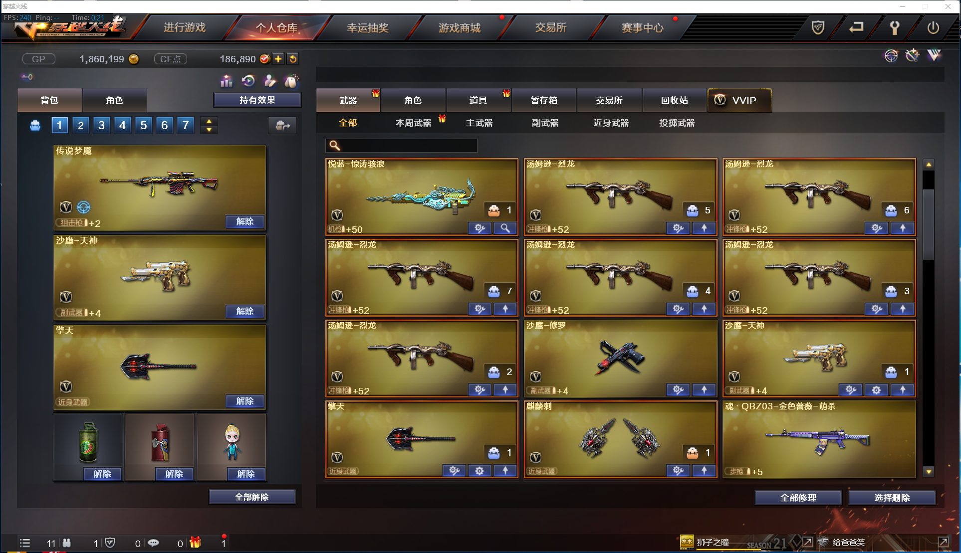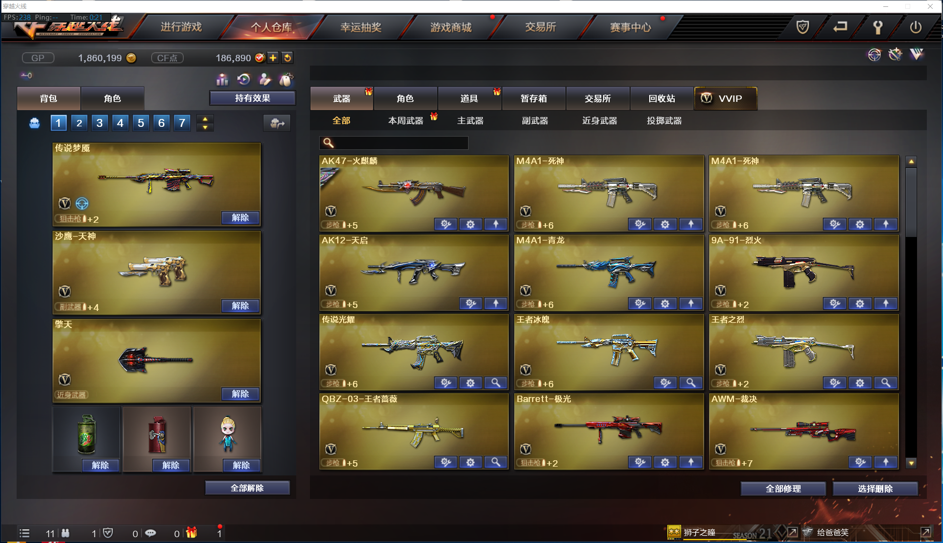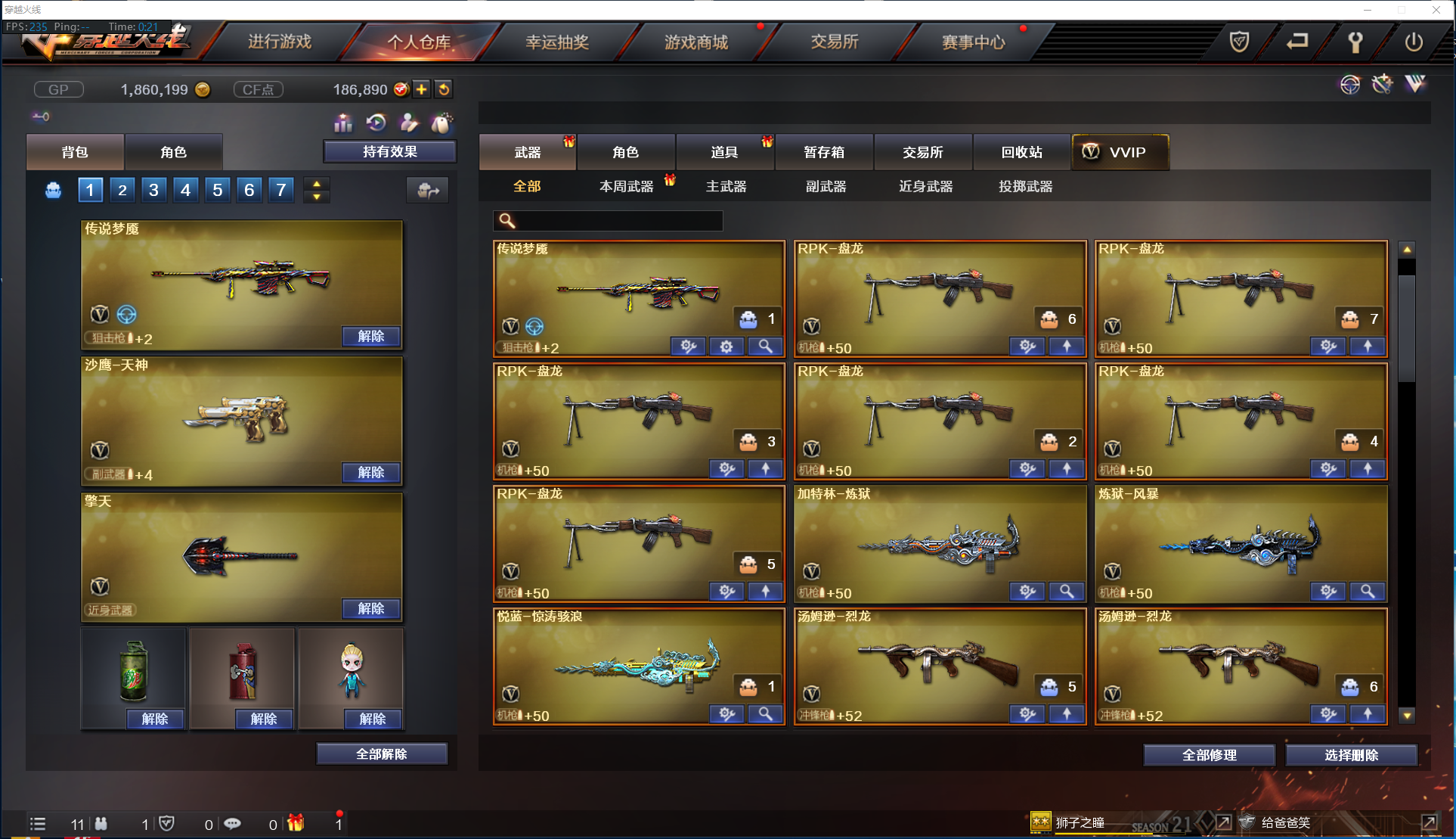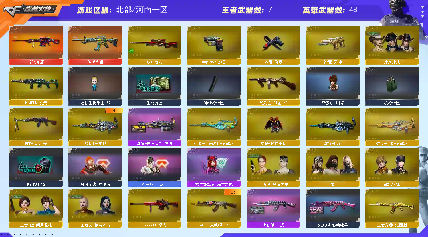【主 武】:传说梦魇、传说光耀、M4A1青龙、QBZ03王者蔷薇(觉醒)、王者冰魄(觉醒)、王者之烈(觉醒)、王者之怒、炫金武士、炫金雷神、炫金毁灭、烈龙X6、斯泰尔蝴蝶、盘龙X6、加特林炼狱、炼狱风暴、悦蓝惊涛骇浪、火麒麟(白虎)、死神X2、天启、烈火、极光、裁决