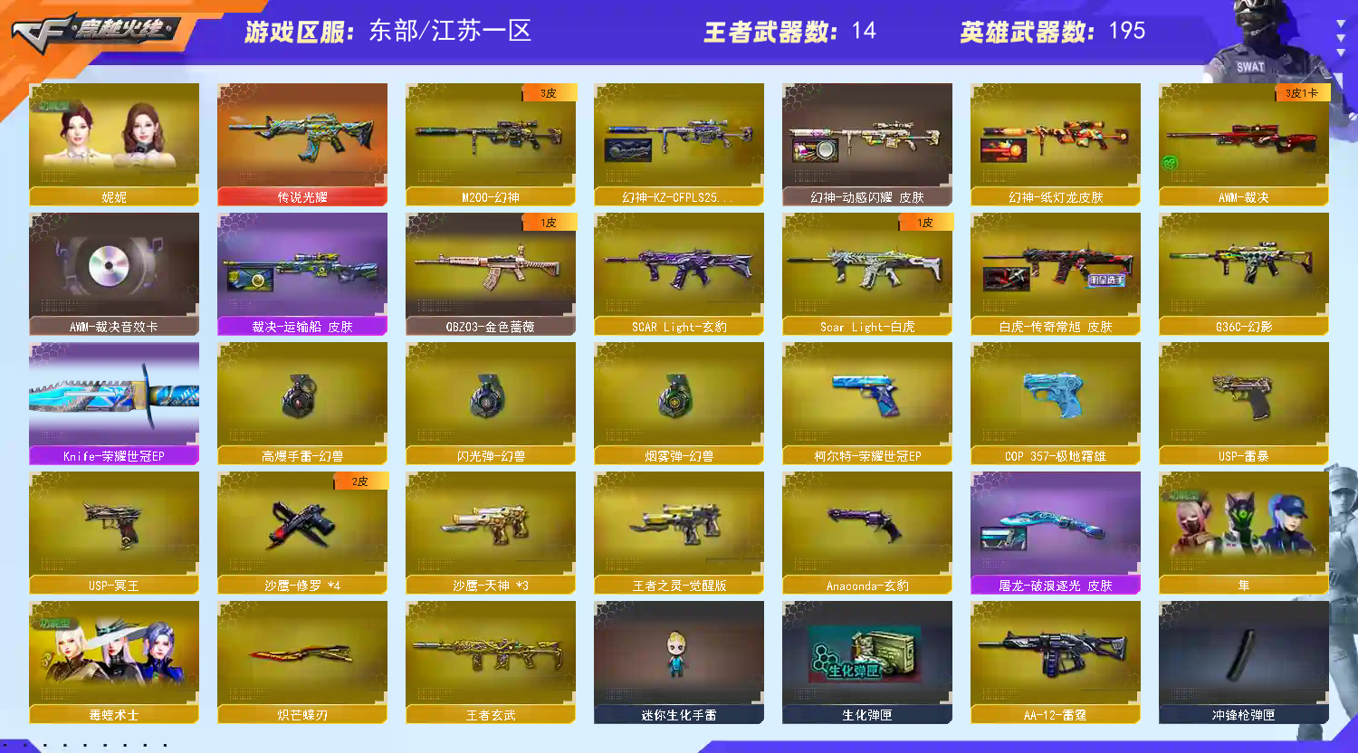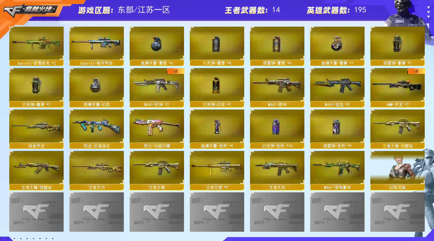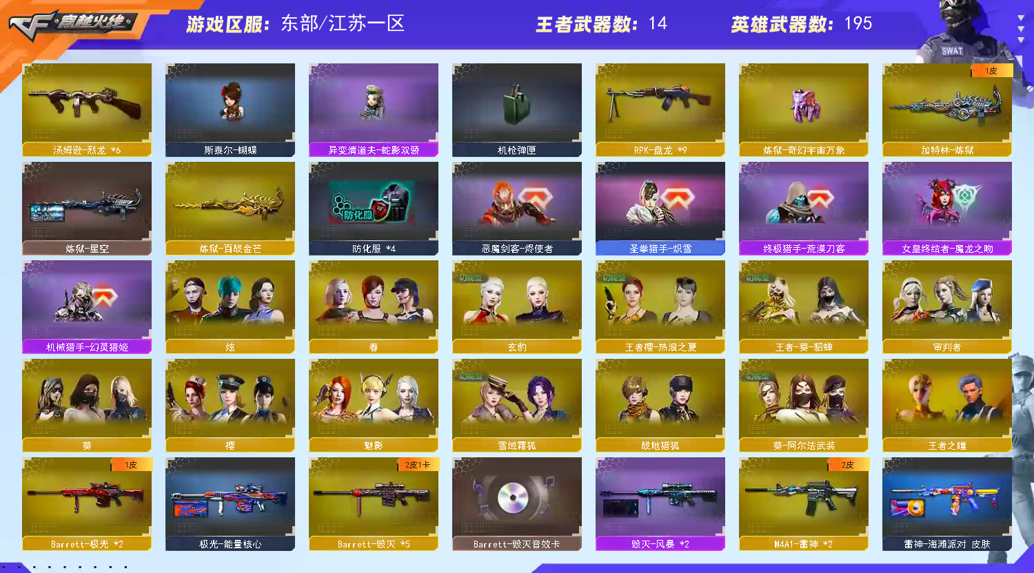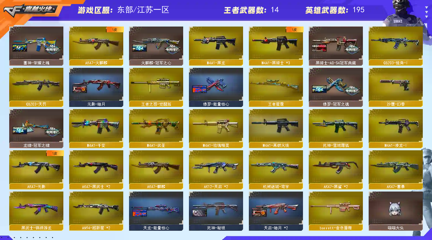 【主武】:火麒麟、麒麟、天龙、9盘龙、黑龙、雷神、6烈龙、黑骑士、玫瑰精灵、毁灭、无影、金牛座、极光、苍雷、死神、天蝎座、黑武士、征服者、白羊座、千变、乱世、处女座、射手座、天启、超新星、神罚、凤凰之怒、武圣、死亡之眼、炼狱、斯泰尔蝴蝶 黑武士 机械迷城、源-雷神、QBZ95幻兽、泰坦破坏者3级、QBZ03-金色蔷薇、Barrett-金色蔷薇、M200赤血龙魂、猎神、HK417-赤血龙魂、AWM裁决、激光毁灭者3级、雷神-暗月、黑鲨、龙血、巨龙咆哮III、AA12-雷霆、M200幻神、AK47-雷暴、神圣爆裂者III、火麒麟STAR(皮肤) 【副武】:沙鹰修罗、COP、天秤座、沙鹰天神、胜利之火、、凤凰之火、沙鹰幻兽、USP-雷暴、其他...