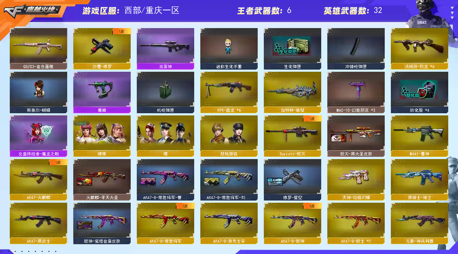 【主武】:天龙-曼陀罗、6盘龙、斯太尔蝴蝶、死亡之眼、雷神、6烈龙、炼狱、Barrett-毁灭、无影、贝雷塔、AK枪王、黑武士、征服者、炫金千变、炼狱、QBZ03-金色蔷薇、Barrett-金色蔷薇、Barrett-暗月传说、激光毁灭者3级、神圣爆裂3级、失恋破坏者3级、AK47-B-战神、AK47-B-常胜将军、黑骑士-海王、战神紫绶勋章(皮肤)、战神粉色甜心(皮肤)、毁灭黑大圣(皮肤)