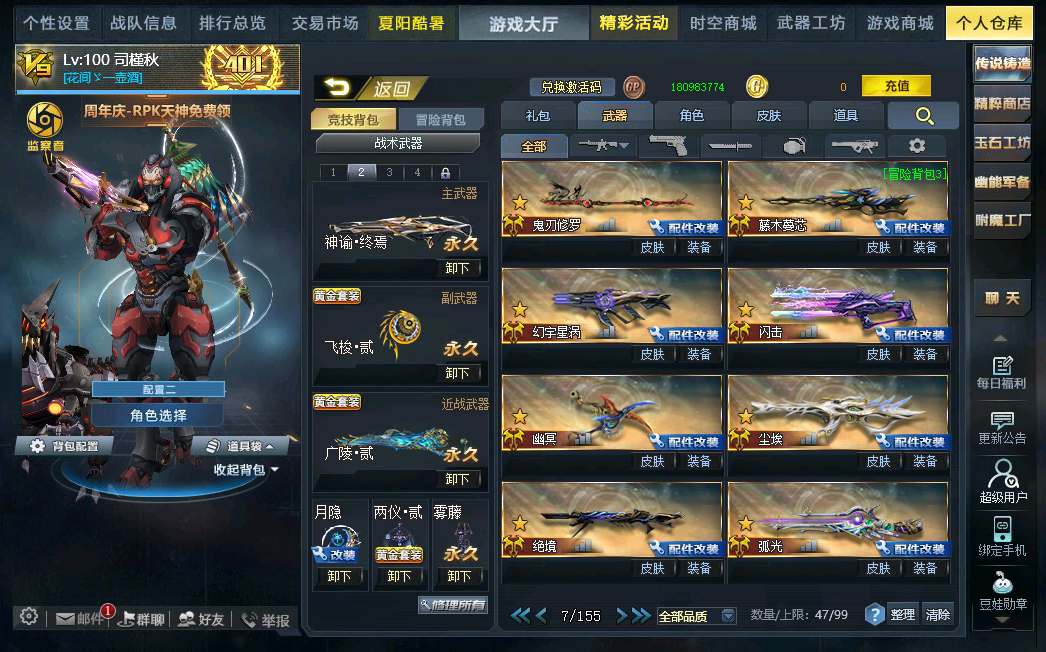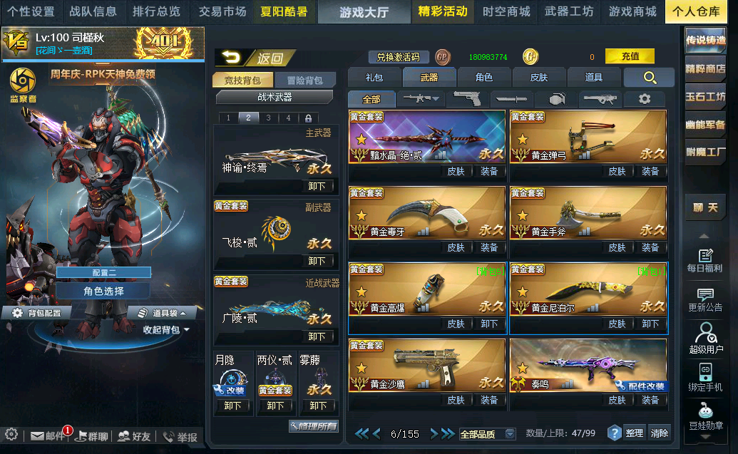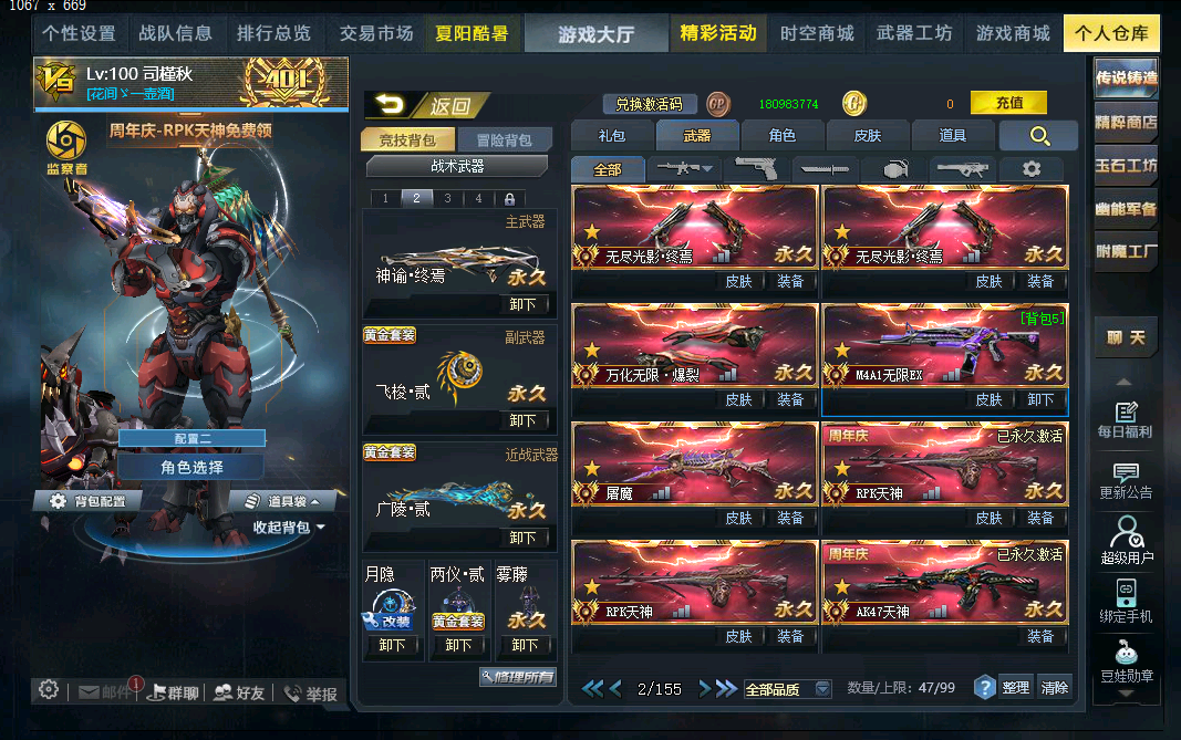 【传说武器】龙息·终焉、 神谕·终焉、墨韵·合、碎星·终焉(祥龙)、雷神·终焉(黑渊)、无尽·终焉*5、万化无限·爆裂、无限EX(紫水晶)、屠魔(御雷)、AK天神*2、rpk天神