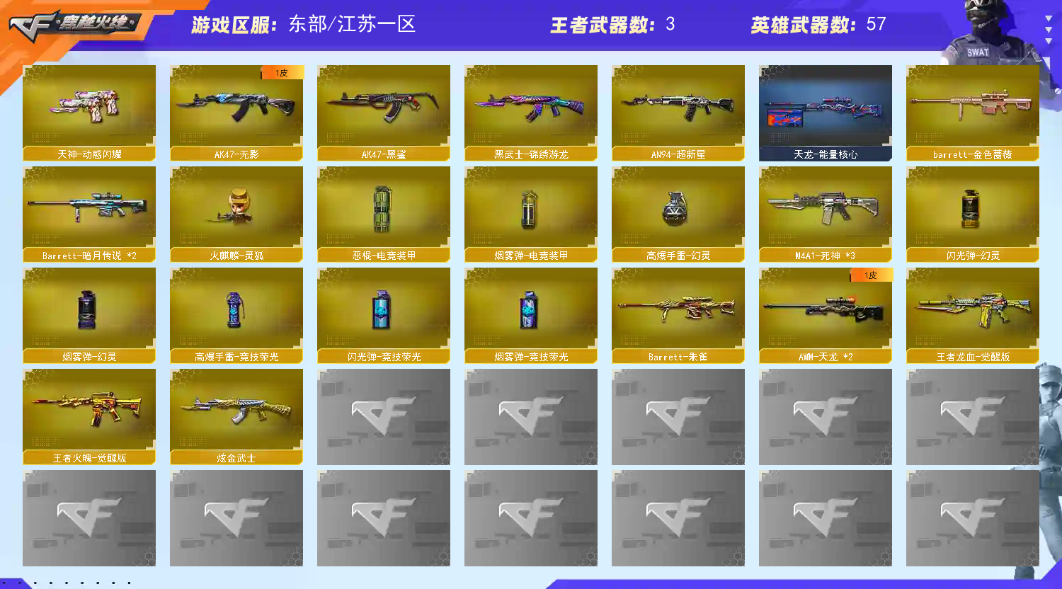 【主 武】:M200竞技荣光、传说辉光、烈龙X6、斯太尔蝴蝶、毒蜂、盘龙X6、炼狱、王者火魄、王者龙血、王者森决、炫金武士、火麒麟、黑龙、雷神、黑骑士、无影、死神、超新星、黑鲨、白虎电玩蓝兔、天龙、毁灭、极光、Barrett朱雀、Barrett金色蔷薇、Barrett暗月传说、金魔等各种活动武器