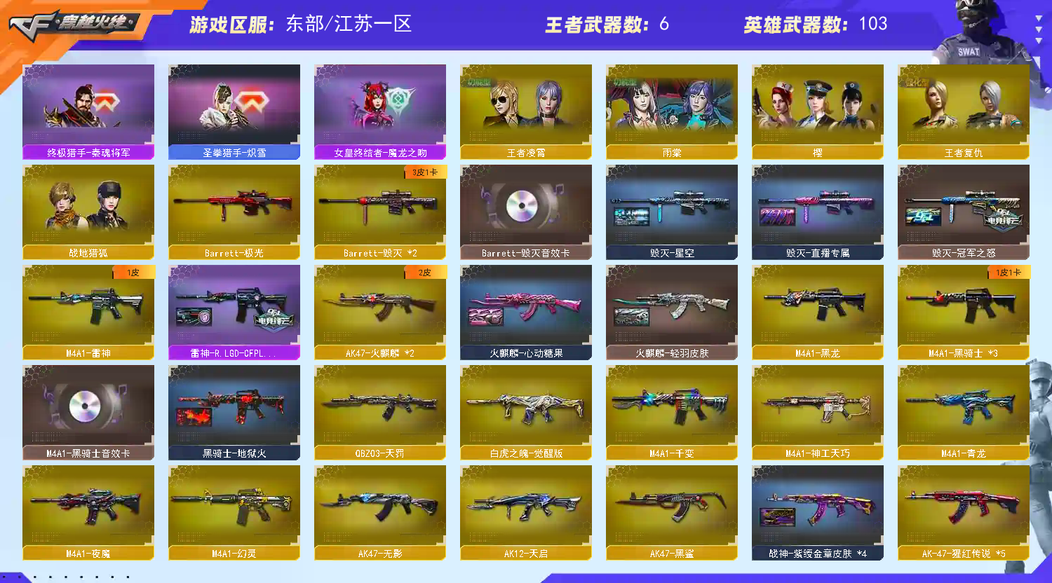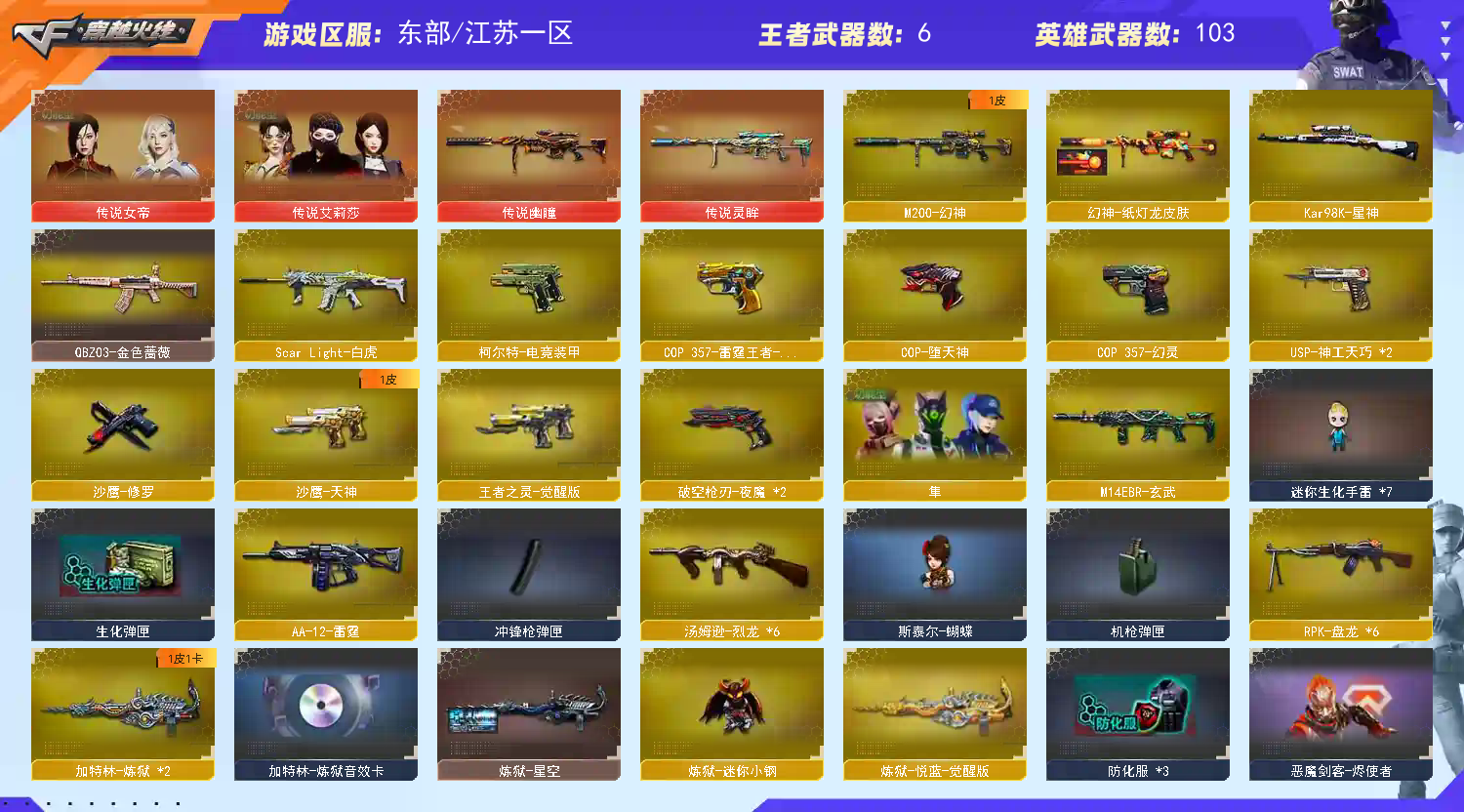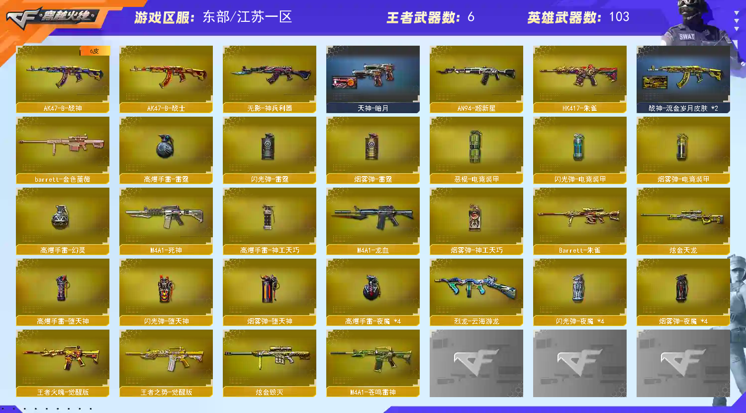 【主 武】:传说幽瞳、传说灵眸、幻神(纸灯笼)、6烈蝴蝶、6盘炼狱、迷你小钢、青龙、朱雀、白虎、夜魔、幻灵、玄武、天罚、神工天巧、白虎之魄、王者之势、王者火魄、火麒麟X2、千变、黑龙、雷神、黑骑士X3、死神、天启、超新星、黑鲨、龙血、QB金色蔷薇、毁灭X2(冠军之怒、魔灵)、极光、Barrett朱雀、AA12雷霆、毁灭征服者、冰龙粉碎者、机甲撕裂者、激光毁灭者、圣炎切割者、深渊巨龙咆哮、神圣爆裂者、试炼破坏者、苍雷、金魔等各种活动武器