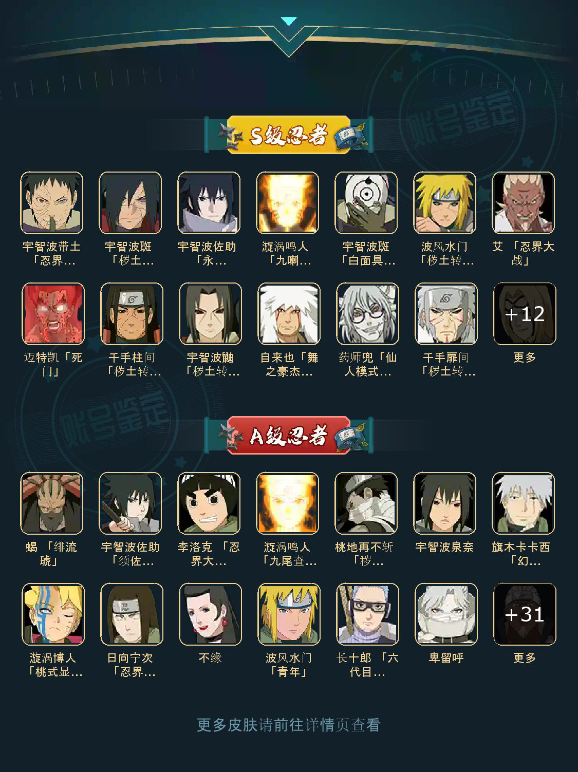 战力:1375W+;VIP5级;S忍22个;A忍36个,通灵兽17个,S忍:大蛇丸波风水门九喇嘛鸣人永恒万花筒佐助普通自来也百豪纲手普通纲手死门凯秽土水门豪杰自来也秽土猿飞秽土扉间千手扉间秽土柱间宇智波斑秽土解斑须佐鼬秽土鼬白面具忍战带土秽