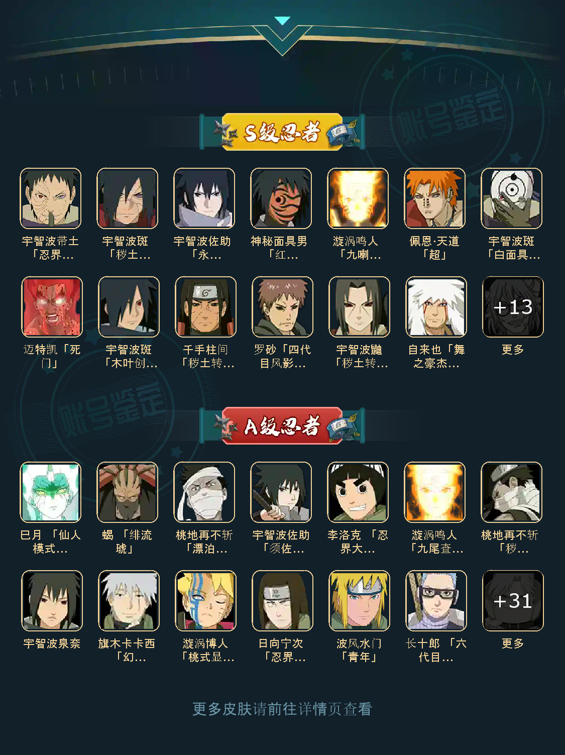 战力:1238W+;VIP11级;S忍24个;A忍33个,通灵兽19个,S忍:普通纲手猿飞日斩九喇嘛鸣人永恒万花筒佐助豪杰自来也大蛇丸死门凯波风水门秽土猿飞秽土柱间秽土斑木叶创立斑秽土解斑须佐鼬秽土鼬神秘面具男白面具忍战带土红夜面具男罗砂三
