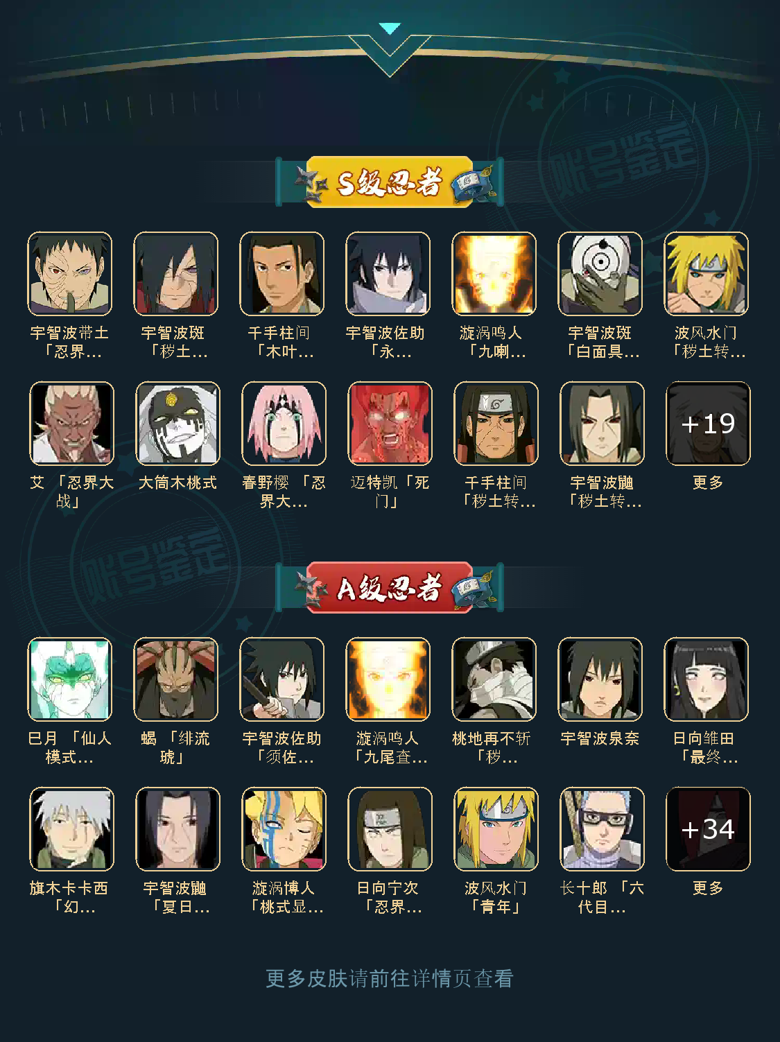 战力:1174W+;VIP11级;S忍28个;A忍38个,通灵兽19个,S忍:大蛇丸九喇嘛鸣人永恒万花筒佐助忍战樱普通自来也百豪纲手死门凯波风水门秽土水门豪杰自来也秽土猿飞秽土扉间千手柱间木叶创立柱间秽土柱间宇智波斑秽土斑秽土解斑秽土鼬白面
