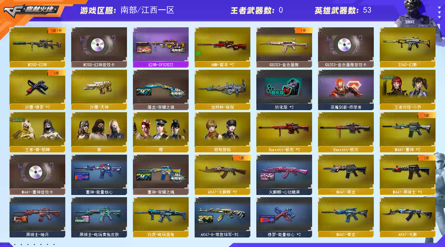 52V 2王者 1炫金 幻神+CFS2022皮肤+音效卡【英雄武器】_M200-幻神/Barrett-毁灭/Barrett-极光(2)/Barrett-暗月传说(2)/AWM-天龙(2)/AWM-裁决(2)/M4A1-青龙/M4A1-雷神(2)/M4A1-死神/M4A1-黑龙/M4A1-龙血/M4A1-黑骑士(3)/白虎-电玩蓝兔/AK47-火麒麟(2)/AK47-无影/AK47-黑武士/AK-47-猩红传说/AK47-B-常胜将军/QBZ03-金色蔷薇/沙鹰-天神/沙鹰-修罗(7)/麒麟刺/麒麟刺-堕天神/龙啸/龙啸-堕天神/擎天/屠龙/高爆手雷-堕天神(3)/烟雾弹-堕天神(3)/闪光弹-堕天神(3)【重要武器皮肤】幻神-CFS2022/天龙-CFSTAR/火麒麟-CFSTAR/火麒麟-心动糖果/AK47-B-常胜将军-刘备/雷神-荣耀之魄/雷神-能量核心/黑骑士-暗月/黑骑士-电玩青兔皮肤/黑龙-暗月/战神-流金岁月皮肤/战神-紫绶金章皮肤/战神-粉色甜心皮肤/修罗耀金皮肤/修罗-CFSTAR/修罗-能量核心/屠龙-荣耀之锋【重要音效卡】M200-幻神音效卡/QBZ03-金色蔷薇音效卡/M4A1-雷神音效卡
