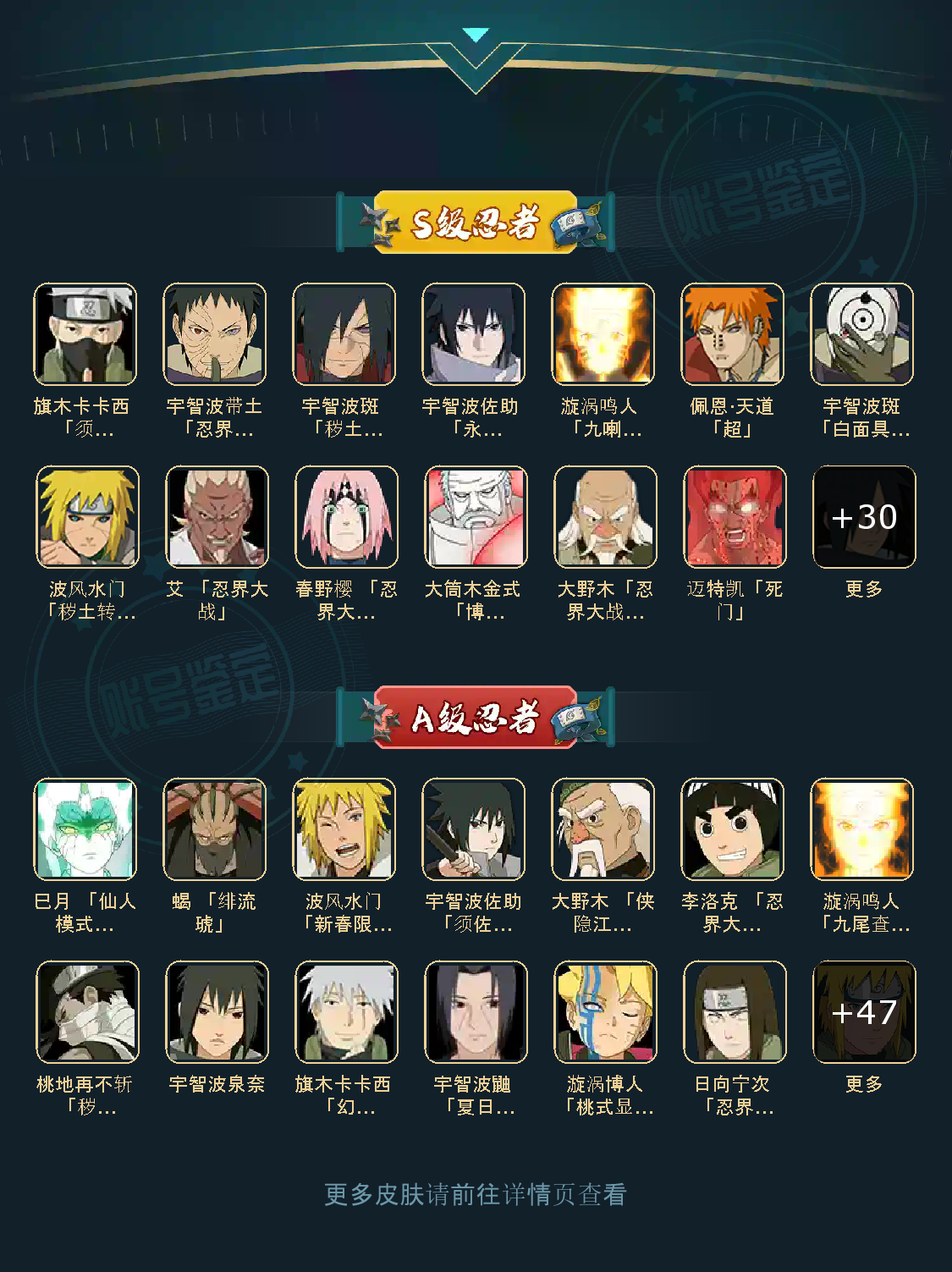 艾「三代目雷影」(3星艾「三代目雷影」),波风水门(3星波风水门),无「二代目土影」(3星无「二代目土影」),千手扉间「秽土转生」(3星千手扉间「秽土转生」),半藏「秽土转生」(3星半藏「秽土转生」),千手扉间(3星千手扉间),宇智波斑(3星宇智波斑),药师兜「仙人模式」(3星药师兜「仙人模式」),猿飞日斩(5星猿飞日斩),艾「忍界大战」(3星艾「忍界大战」),宇智波斑「秽土转生·解」(3星宇智波斑「秽土转生·解」),宇智波鼬「秽土转生」(3星宇智波鼬「秽土转生」),佩恩「天道」(3星佩恩「天道」)