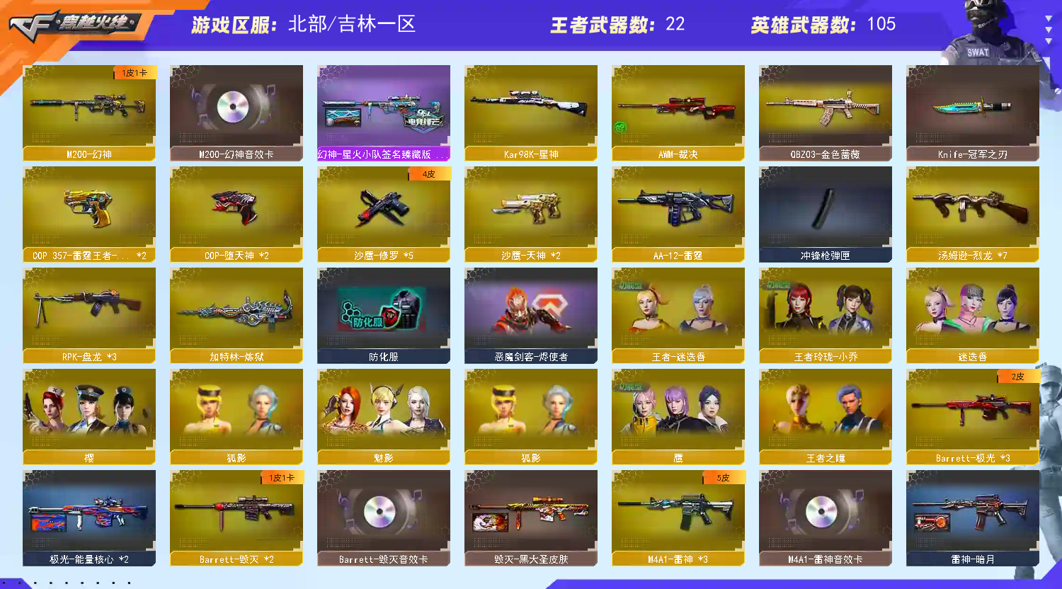 狙击枪稀有皮肤(6) 毁灭-黑大圣皮肤,Barrett-极光-能量核心,天龙-CF STAR,天龙-秘银,天龙-能量核心,幻神-星火小队签名臻藏版