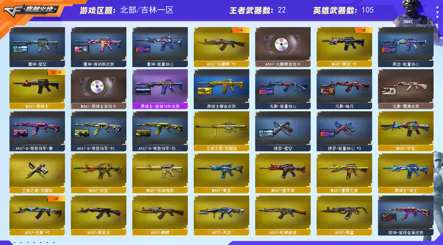 V武器(56) AK47-火麒麟,AK47-无影,AK47-黑鲨,AK47-黑武士,AK47-麒麟,AK47-机械迷城,M4A1-雷神,M4A1-黑骑士,M4A1-死神,M4A1-黑龙,M4A1-堕天神,M4A1-青龙,M4A1-龙血,M4A1-武圣,M4A1-千变,M4A1-猎神,M4A1-玫瑰精灵,Barrett-毁灭,Barrett-极光,蔷薇大炮,AWM-天龙,AWM-裁决,M200-幻神,Kar98k-星神,AA-12-雷霆,AN94-超新星,AK12-天启,HK417-朱雀,QBZ03-金色蔷薇,9A91-烈火,RPK-盘龙,汤姆逊-烈龙,加特林-炼狱,沙鹰-修罗,沙鹰-天神,屠龙,龙啸,麒麟刺,擎天,黑骑士-海王,AK47-B-常胜将军,Barrett-暗月传说,斩神刀-雷暴,幻灵之锋,AK47-B-战士,AK47-B-战神,AK-47-猩红传说,裁决,烈龙,盘龙,修罗,龙啸-堕天神,麒麟刺-堕天神,Glock18-武圣,COP-堕天神,AK47-B-身先士卒