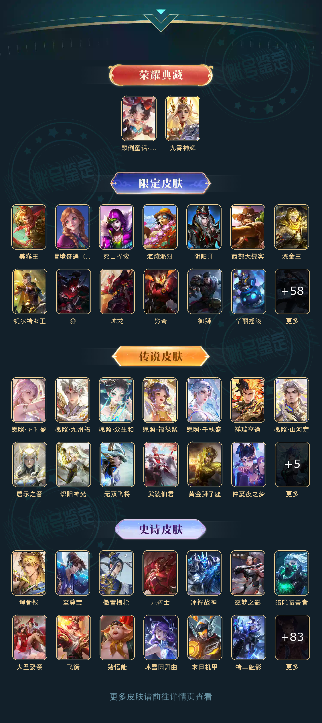 英雄数量121,典藏皮肤数1,皮肤数量298,武陵仙君/黄金狮子座/启示之音