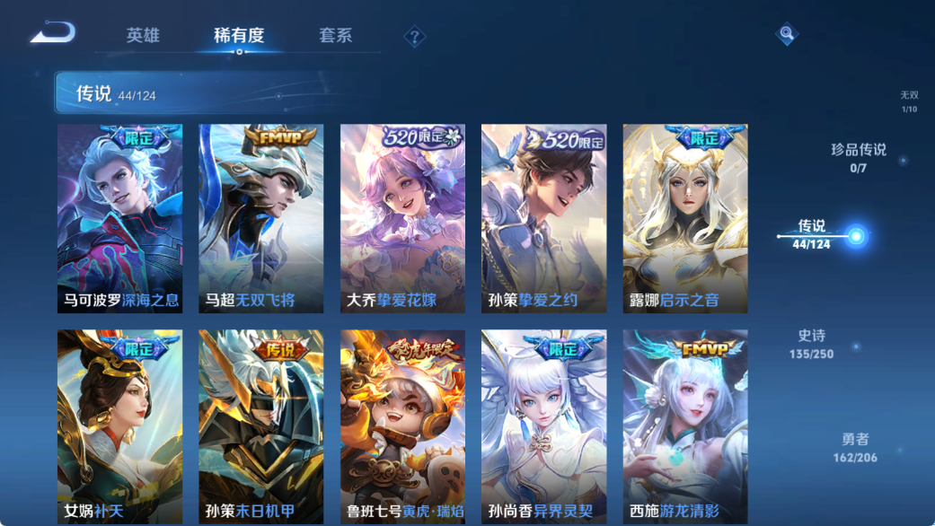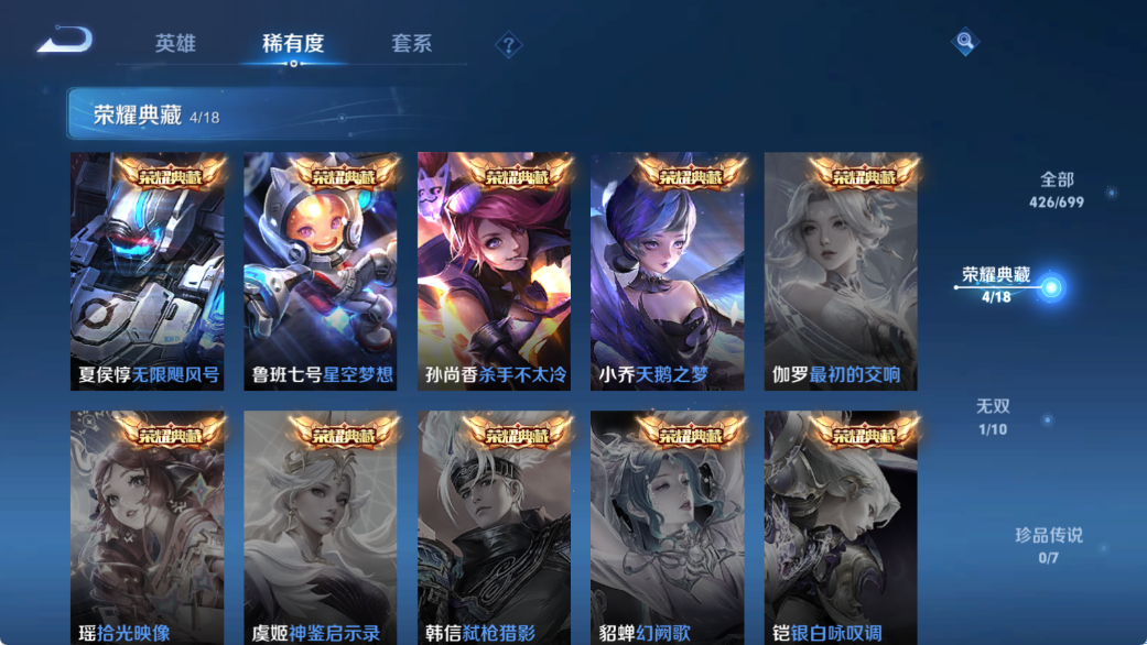天鹅之梦,星空梦想,无限飓风号,碎月剑心,白虎志,李逍遥,默契交锋(花木兰),圣诞老人,热情桑巴,乘龙·问璇玑,乘龙·淬吴钩,乘龙·铭钟鼎,乘龙·聚宝船,至尊宝,真爱至上,愿照·众生和,匿光追影者,无双飞将,挚爱之约,挚爱花嫁,深海之息,补天,异界灵契,启示之音,神树通天,傲雪梅枪