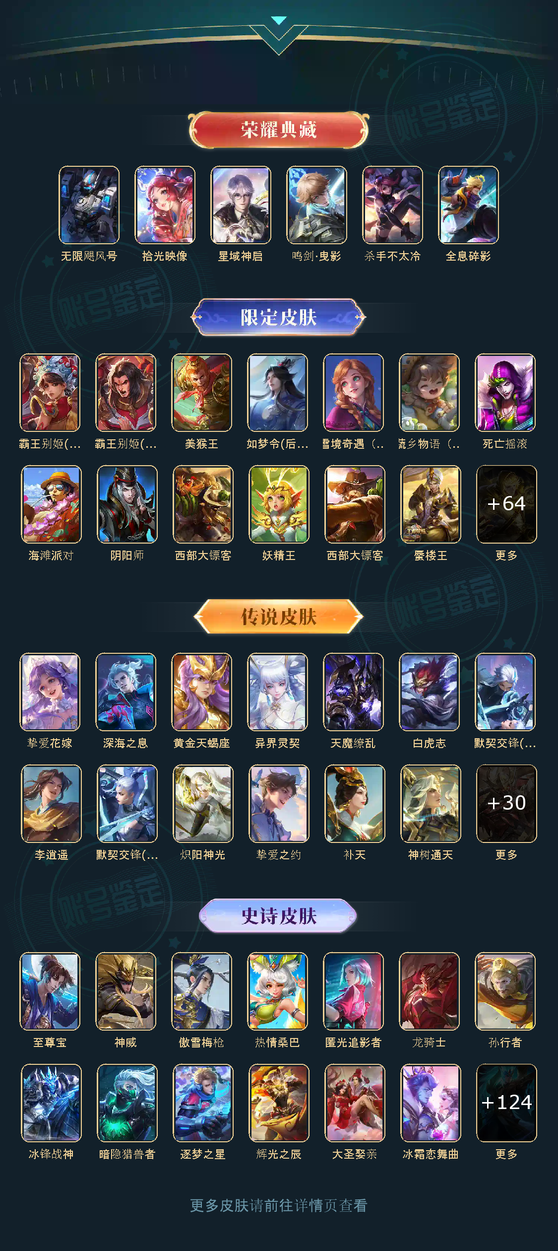 贵族等级V10,英雄数量124,典藏皮肤数5,皮肤数量427,