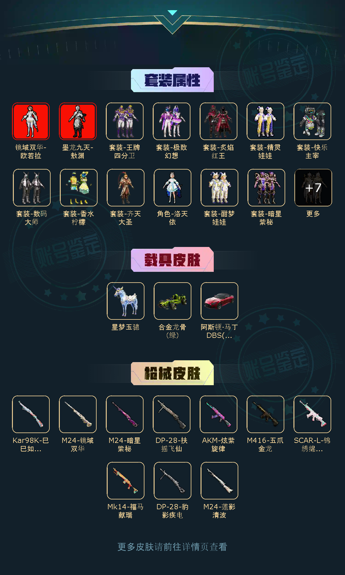 【稀有资产】墨龙九天-敖渊[2级]/镜域双华-欧若拉[3级]/角色-真理款战斗服/套装-奇异狩猎者/套装-萌熊伴侣/套装-浪漫天命/套装-潮萌小黄鸭/套装-雪山精英/套装-龟仙人/套装-迅捷狂鲨/套装-浪漫波比/角色-粉雾星云/套装-暗夜武装/套装-东方飞龙/M416-仓鼠灰灰