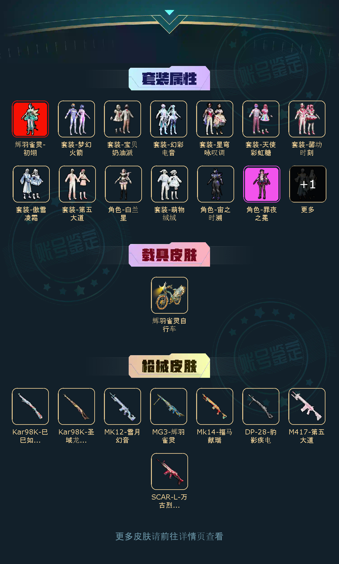 【稀有资产】辉羽雀灵-初翊[3级]/套装-第五大道/SCAR-L-万古烈焰/角色-8号机/套装-暗影哥特/套装-龟仙人/套装-绒宝小鹅/套装-缤纷假日/套装-圣穹绘梦/玩偶服-卖崽青蛙/玩偶服-神气赞萌露比/玩偶服-美羊羊/角色-绊爱/角色-摩登魅猫/角色-乐音/角色-鲛海歌灵/角色-海琴烟