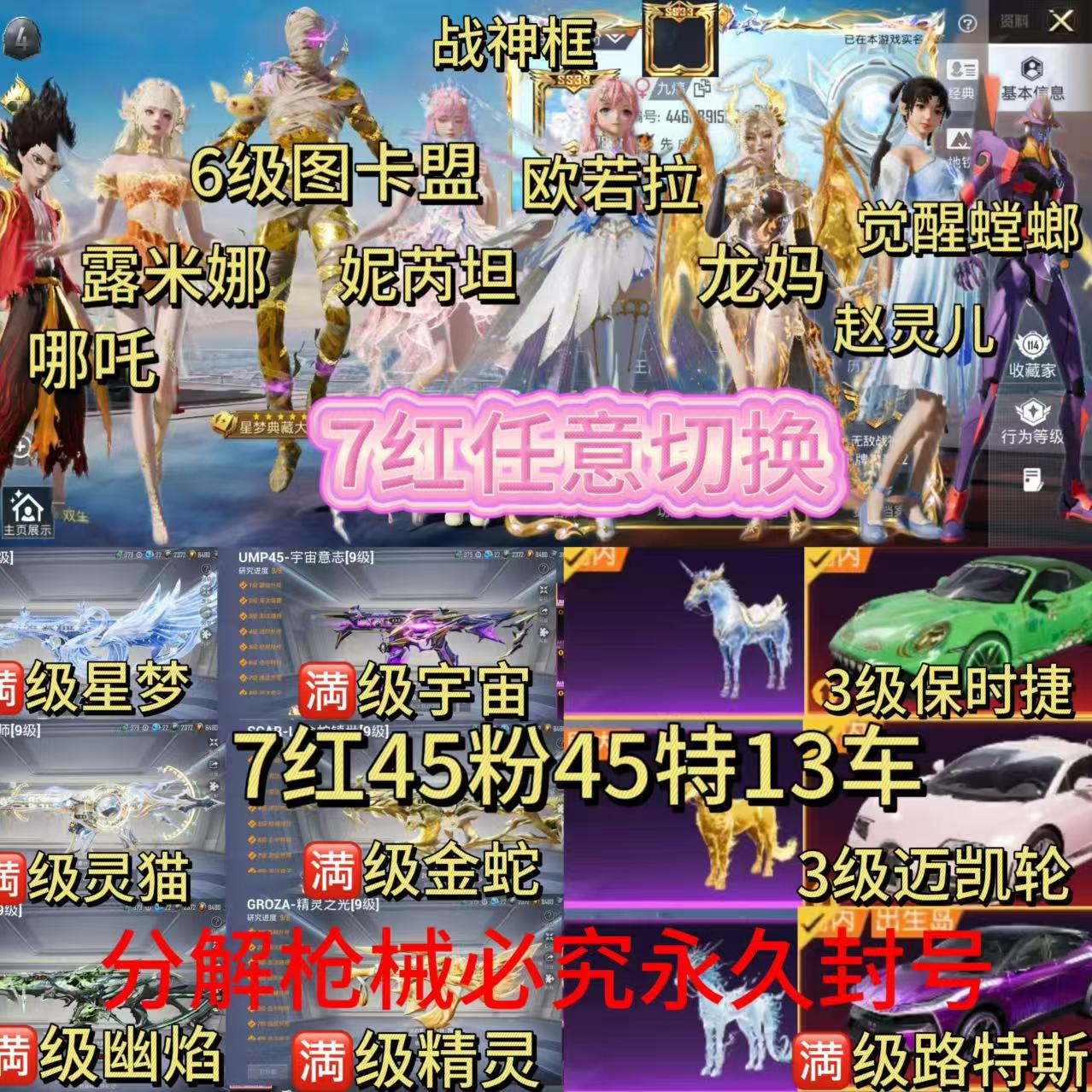 aq战神框 6级图卡盟 哪吒 雪国男神套 9级星梦 9级灵猫 9级金蛇 9级精灵 9级幽焰 9级宇宙 6级路特斯 3级小暴龙 7红45粉45特13车