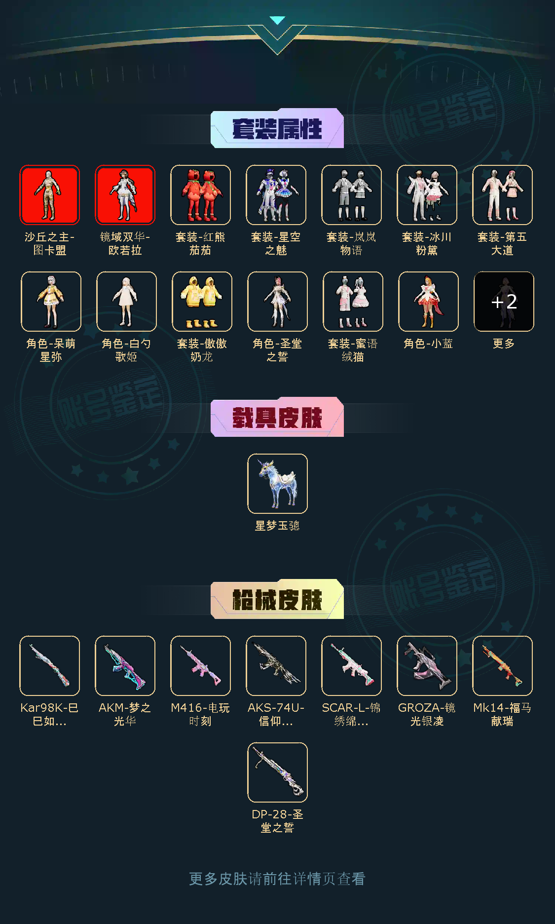 【稀有资产】沙丘之主-图卡盟[3级]/镜域双华-欧若拉[1级]/套装-第五大道/AKM-梦之光华/M416-电玩时刻/小恶魔头饰/套装-龟仙人/套装-红熊茄茄/套装-宝石天鹅/套装-萌神柯基/套装-软软小魔女/玩偶服-懒羊羊/角色-摩登魅猫/角色-白光莹