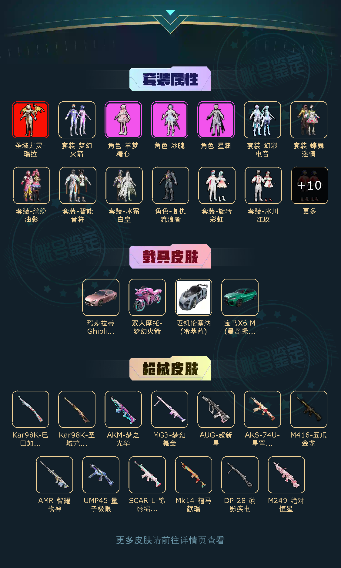 【稀有资产】圣域龙灵-瑞拉[3级]/角色-千金淑猫/角色-羊梦糖心/套装-缤纷油彩/AUG-超新星/M416-五爪金龙/AKM-梦之光华/套装-浪漫天命/套装-龟仙人/套装-狂沙舞者/玩偶服-喜羊羊/角色-都市丽猫/角色-摩登魅猫/角色-2B战斗服款/角色-灵公主/角色-冰公主