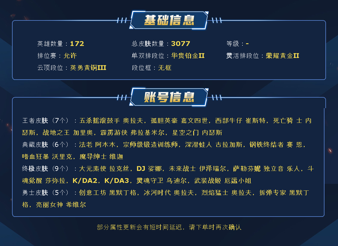 黑色精选号,3000皮、1569原皮、1488炫彩,8色龙瞎。海量限定皮肤,基本全英雄都有大量皮肤,
