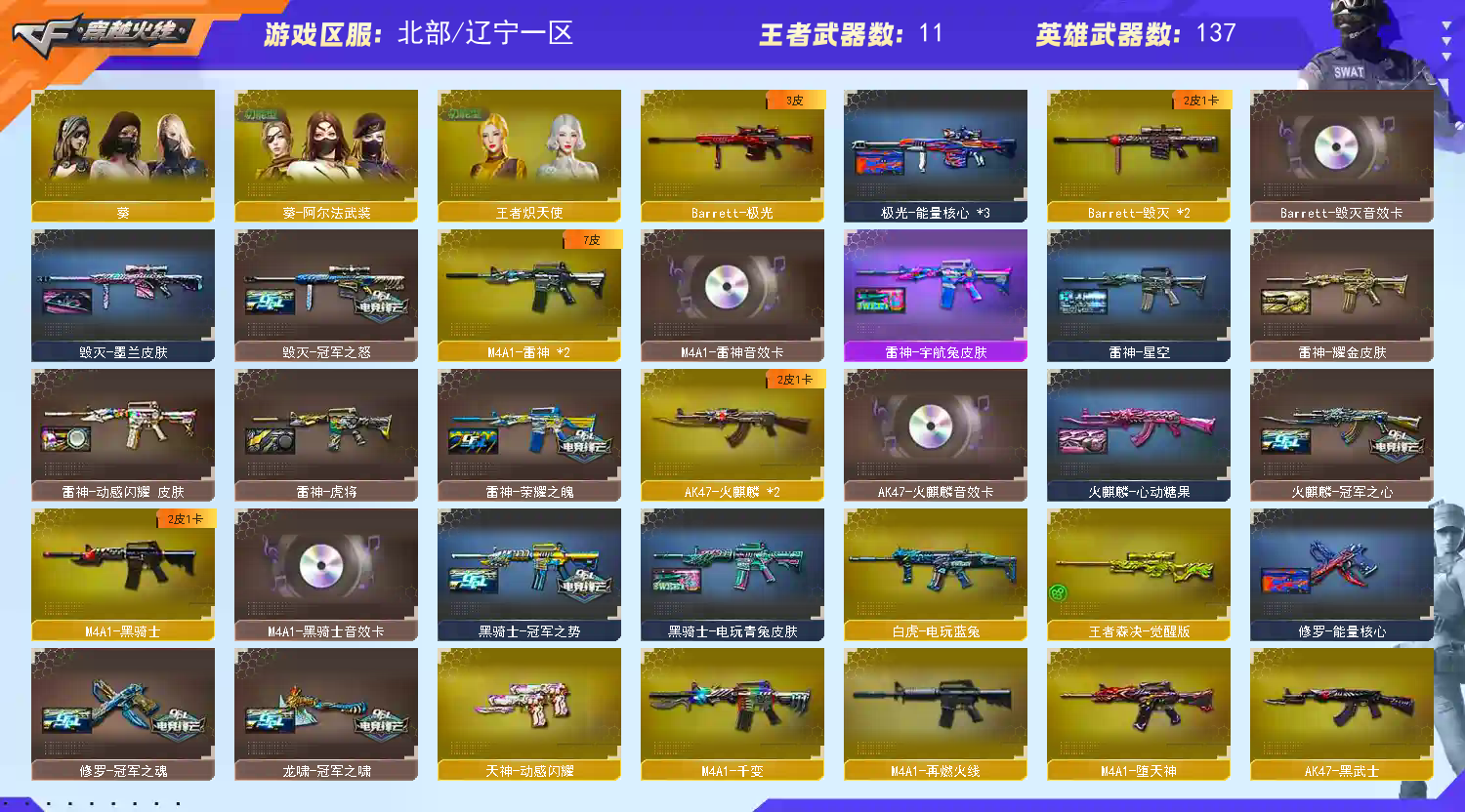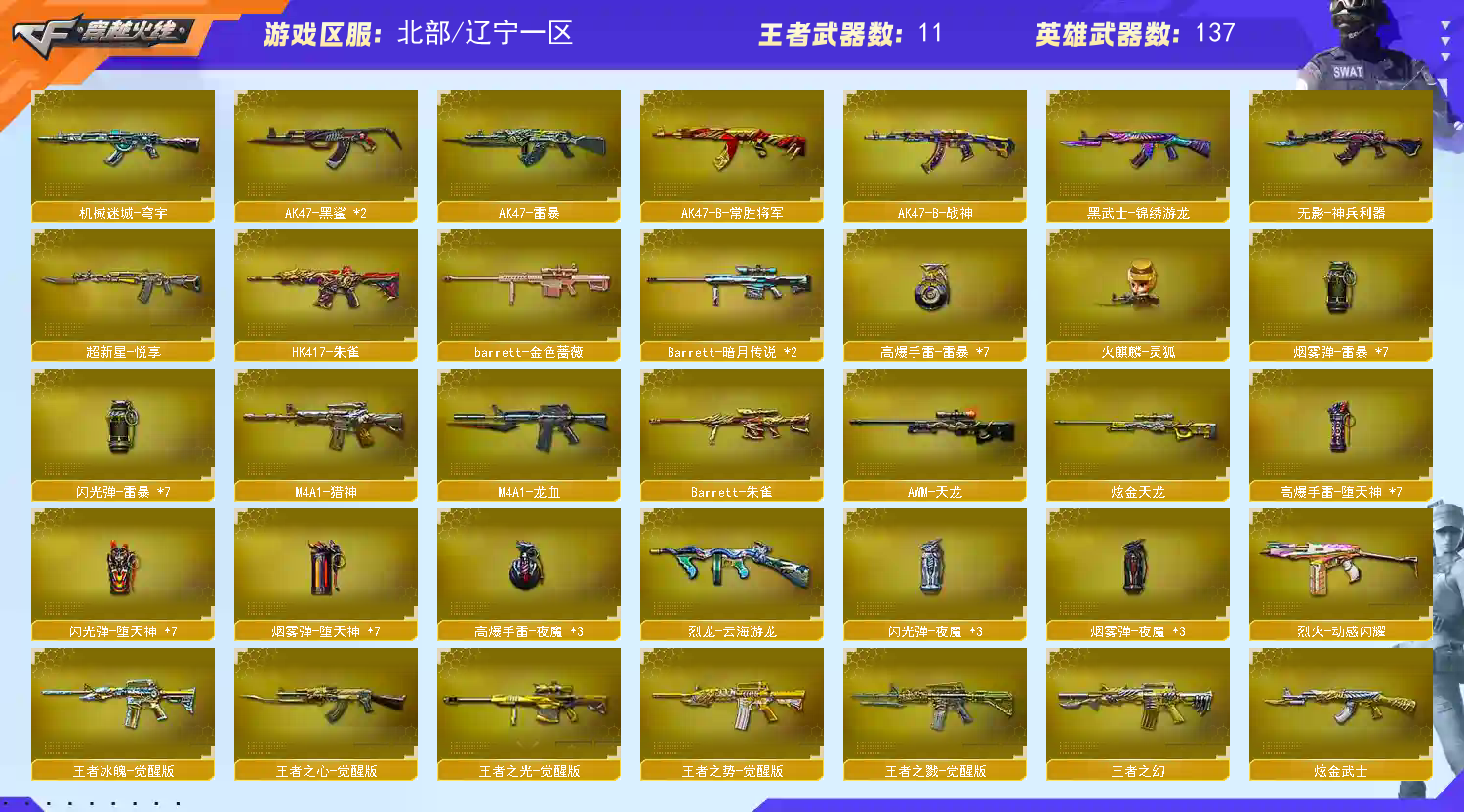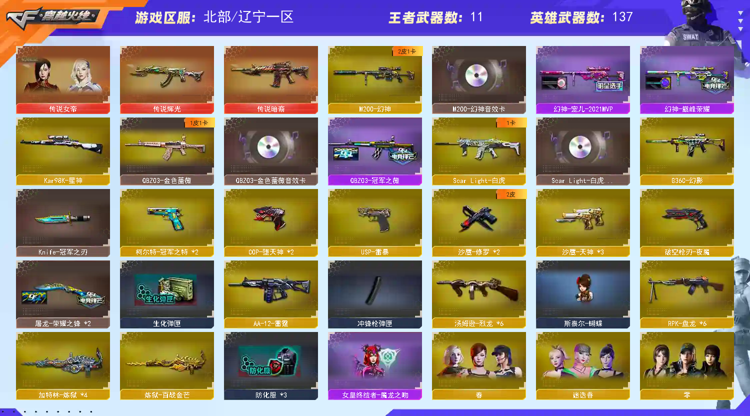 【主武】:G36C-幻影、天神-动感闪耀、烈火-动感闪耀、传说辉光、传说暗裔(新品首发)x2、Kar98K-星神(首发)、Scar Light-白虎(首发)x2、烈龙x6、盘龙x7、加特林炼狱x4、AA12-雷霆、M200-幻神、Barrett-朱雀、HK417-朱雀(首发)x2、AK47-雷暴、M4A1-堕天神(首发)、QBZ03-金色蔷薇、毁灭x2、天龙、极光、Barrett-暗月传说、barrett-金色蔷薇、雷神x2、火麒麟x2、黑骑士、黑武士、千变、黑鲨x2、龙血、烈火、猎神、AK47-B-战神、天蝎座x3、处女座x4、激光毁灭者III、M4A1-十二生肖·龙-雷神x2、M200-赤血龙魂x2、黄金M4A1-X(经典枪王)、98K-冰雪霸主x2、破天狂龙、暗金M200、黄金MP5-A、黄金KAC、