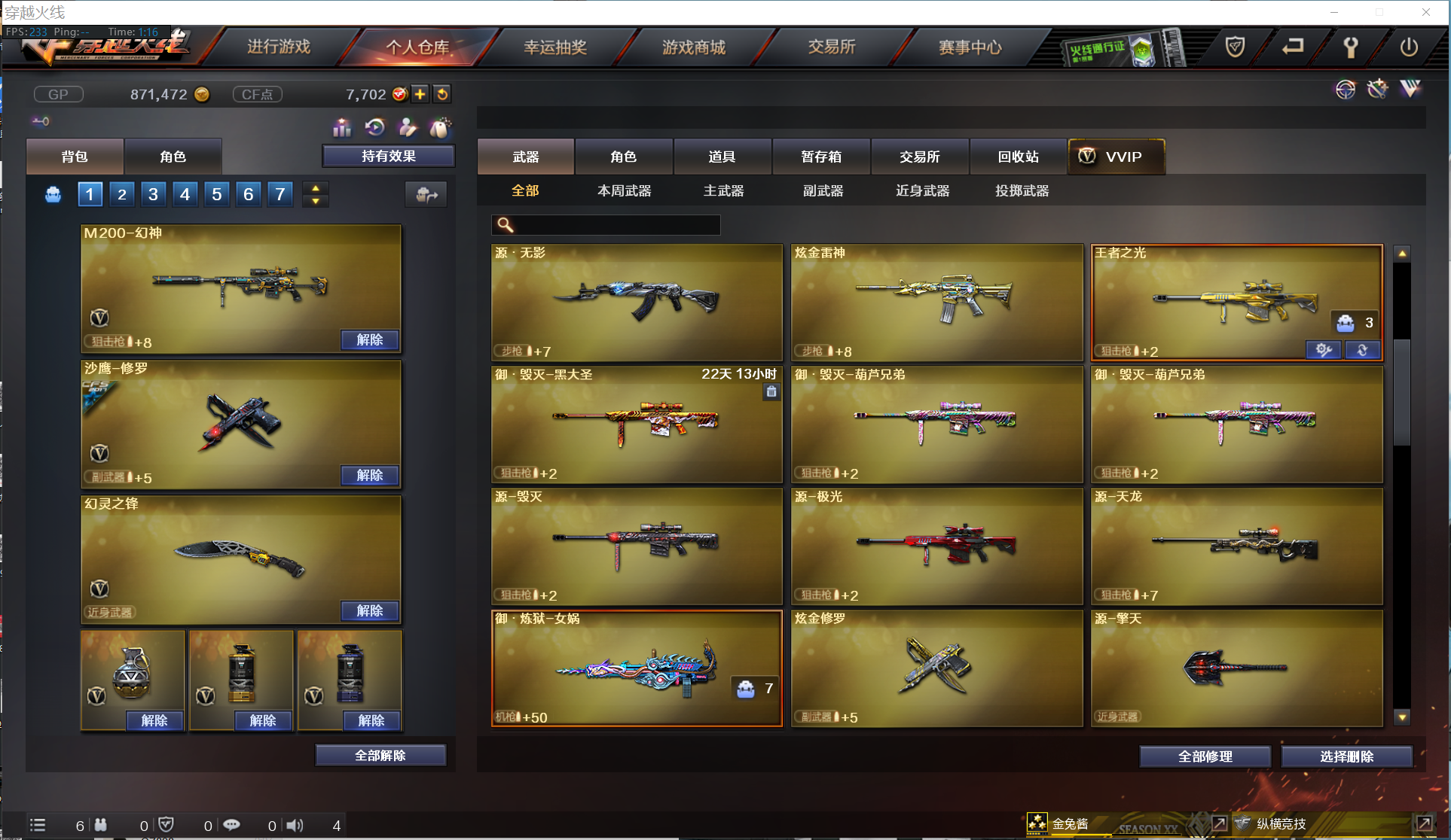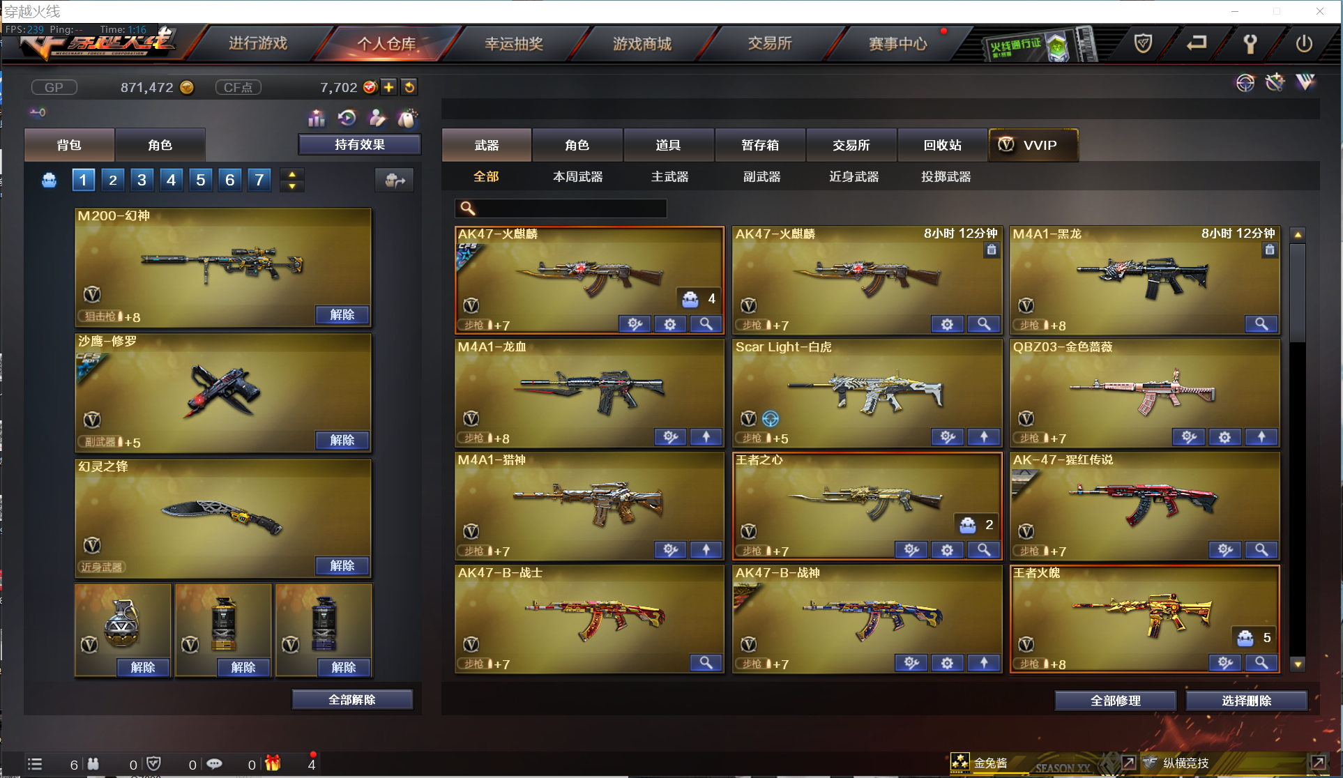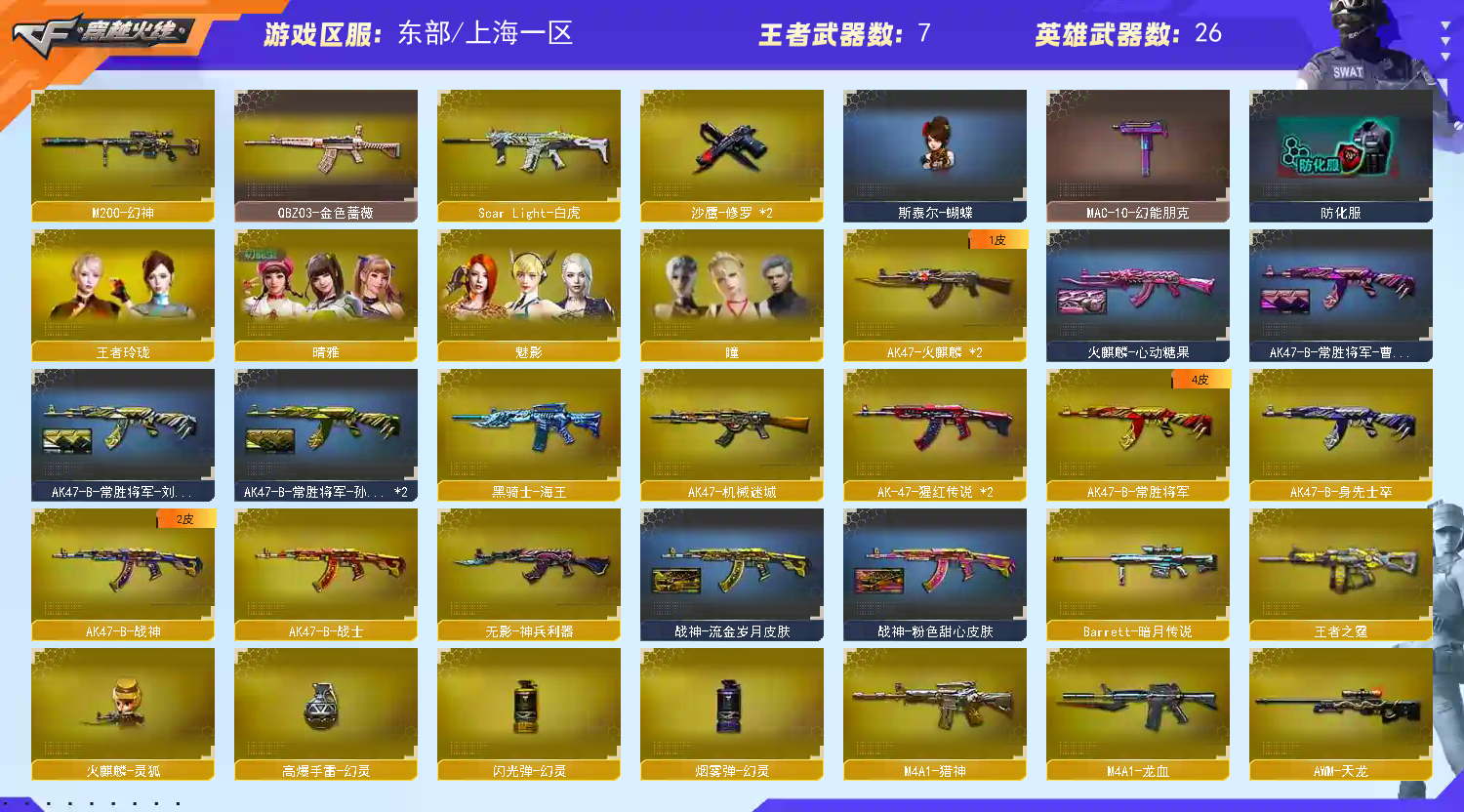 【主 武】:M200幻神、ScLi白虎、王者之心(觉醒)、王者火魄(觉醒)、王者之光、炫金雷神、火麒麟(CFS2018、CFSTAR)、龙血、QBZ03金色蔷薇、猎神、AK47-猩红传说(老兵传说皮肤)、AK47-B-战士、AK47-B-战神(粉色甜心皮肤、流金岁月皮肤、紫媛金章皮肤)、黑骑士海王、AK17-B-身先士卒、AK47-B-常胜将军(常胜将军孙权、常胜将军刘备、常胜将军曹操)、Barrett暗月传说、冰龙粉碎者白马银枪、极光毁灭者、斯泰尔蝴蝶