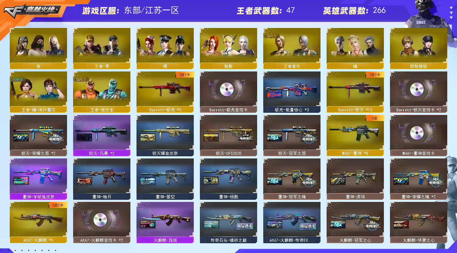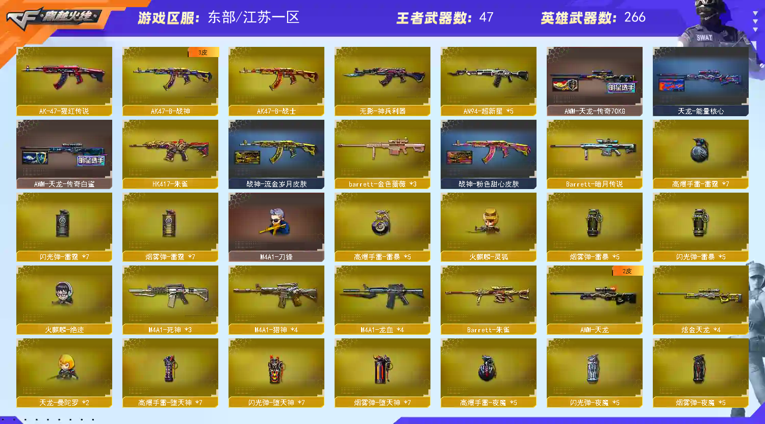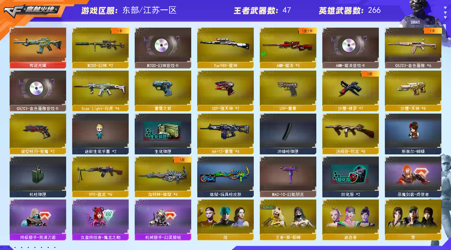 【主武器】②M200-幻神/98K-星神/王者幻神/传说光耀/④白虎/朱雀/青龙/王者蔷薇qbz觉醒/斯太尔蝴蝶/炼狱悦蓝/④炼狱/⑥烈龙⑥盘龙/千变/5火麒麟/6黑龙/8雷神/6黑骑士/无影/3死神/8黑武士/4天启/5超新星/4武圣/2机械迷城/4黑鲨/4龙血/m4雷霆/ak雷暴/M4堕天神/M4夜魔/5玫瑰精灵/6蔷薇qbz/4猎神/烈火/王者之心觉醒/王者之武觉醒/王者之魄觉醒/王者之幻觉醒/王者之圣觉醒/超新星悦享觉醒/猩红传说/黑武士网剧套装/王者火魄觉醒/白虎电玩蓝兔/天龙/13毁灭/5极光/4裁决/雷霆大炮/2裁决/朱雀大炮/3蔷薇大炮/王者之决觉醒/4AA12雷霆/2雷神精英刀锋/火麒麟绝技/火麒麟令狐/王者炎心/王者之城/王者之幻/王者之戮/2王者之魄/王者之势/王者之武/王者之翼/王者之影/王者之鲨/2炫金超新星/4炫金黑龙/炫金火麒麟/3炫金雷神/炫金骑士/炫金无影/4炫金武士/2天龙曼陀罗/2王者之光/3王者之力/4王者之怒/炫金毁灭/4炫金天龙/黑龙吞噬者/毁灭征服者超越6/死亡之眼/cat猫枪/金色小号/牛牛AK47/M37葵