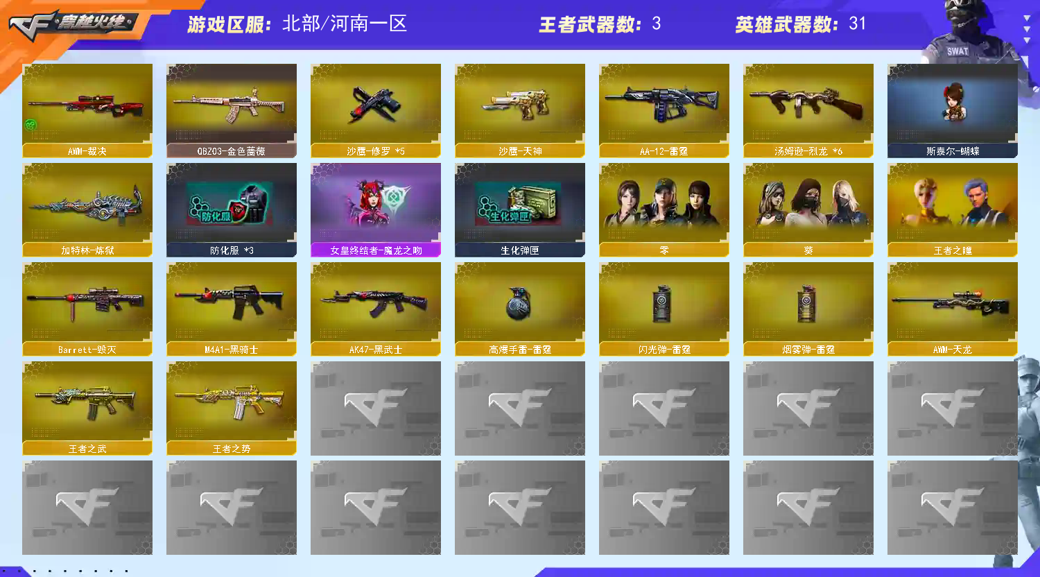 【主武器】王者之势 王者之武 源天龙 源雷神 源火麒麟 青龙魂 M4A1-英雄-能量核心 M4A1-十二生肖龙-雷神 AA-12-雷霆 烈龙*6 炼狱 裁决 毁灭 天龙 QBZ03-金色蔷薇 黑武士 黑骑士 斯太尔-蝴蝶 死亡之眼 冰龙粉碎者 征服者