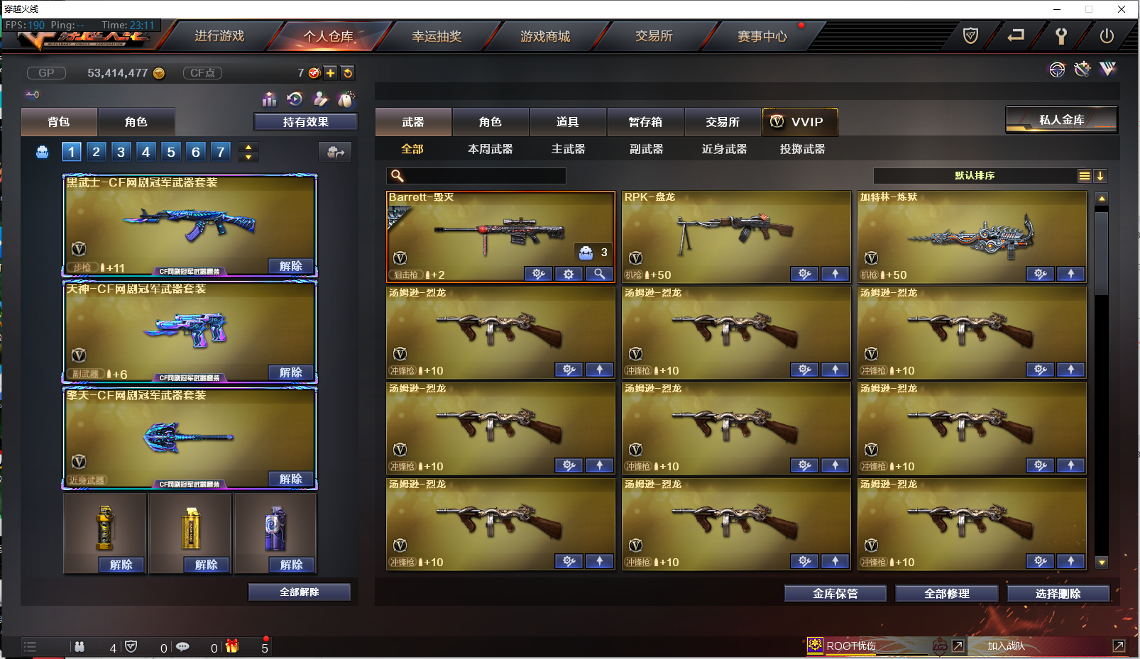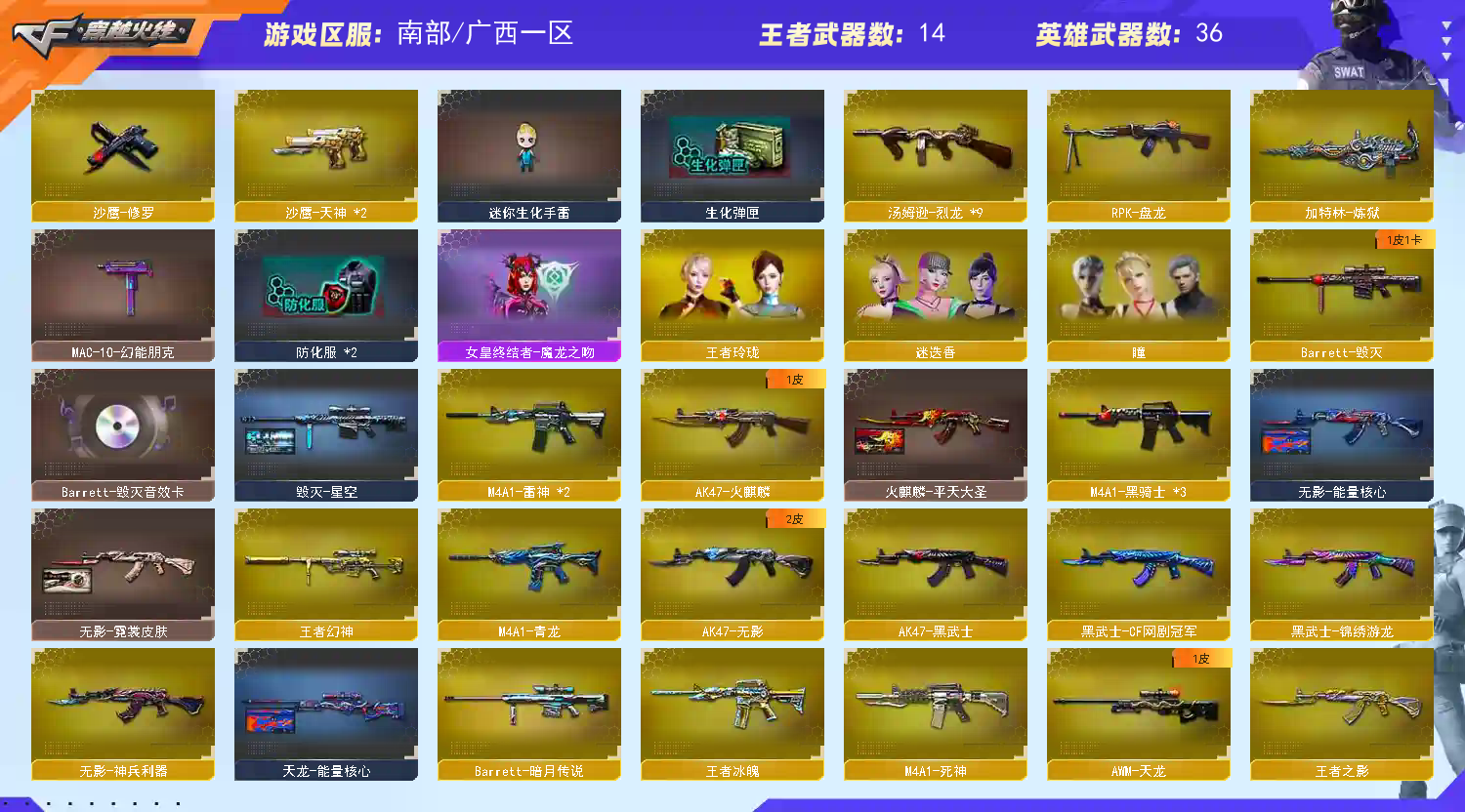 【主武】AK47-火麒麟、M4A1-雷神、M4A1-黑骑士、AK47-无影、M4A1-死神、AK47-黑武士、M4A1-青龙、黑武士-CF网剧冠军武器、AWM-天龙、毁灭、盘龙、炼狱、9烈龙、王者幻神
