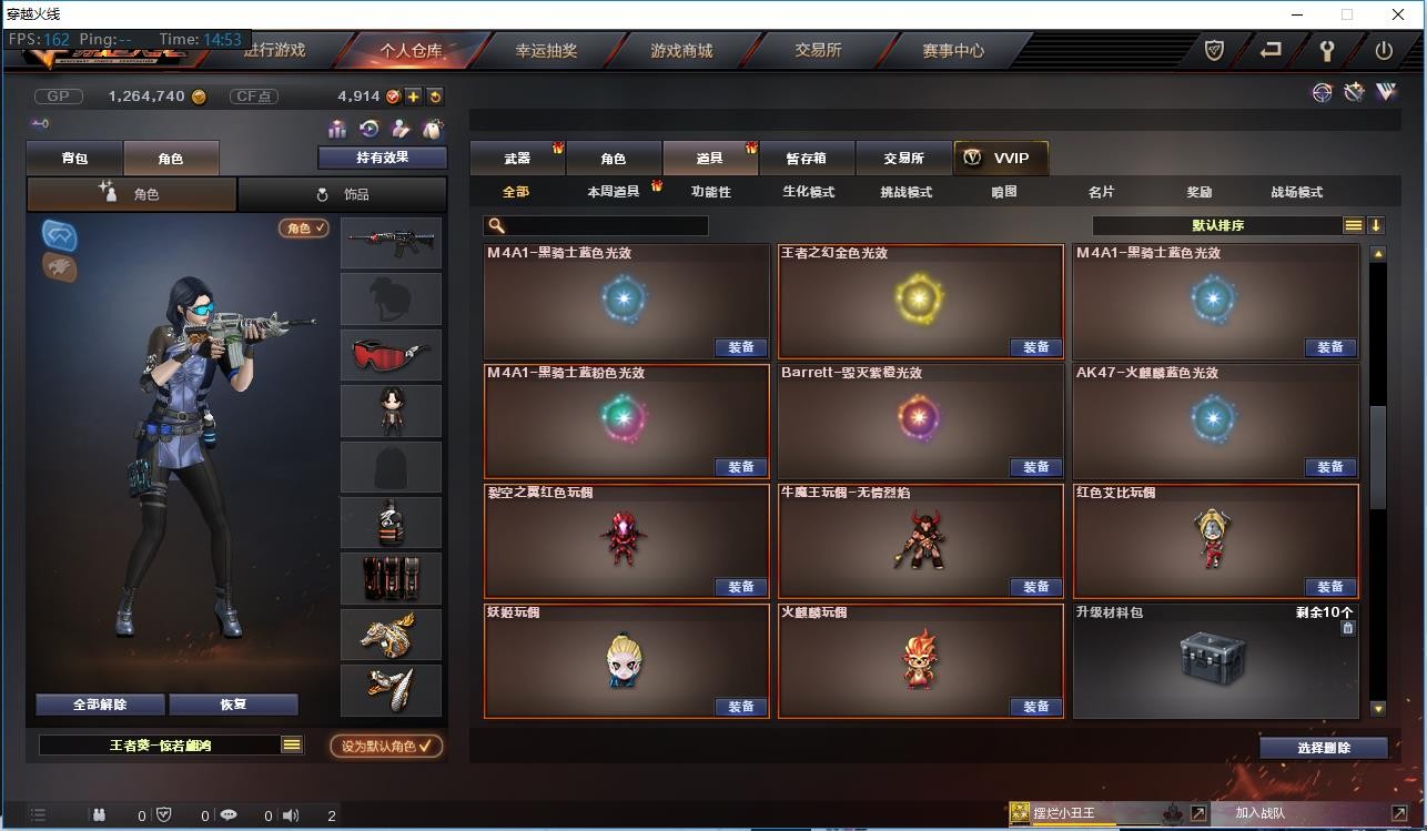 【道 具】:黑骑士音效卡、裂空之翼玩偶、牛魔玩偶、红色艾比玩偶、妖姬玩偶、火麒麟玩偶、7个背包、AC(防弹头盔-防弹衣)、C4工具钳、手雷包、挑战弹夹、冲锋枪弹夹、机枪弹夹、手枪弹夹、步枪弹夹、狙击枪弹夹、散弹枪弹夹