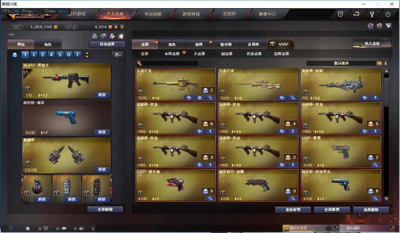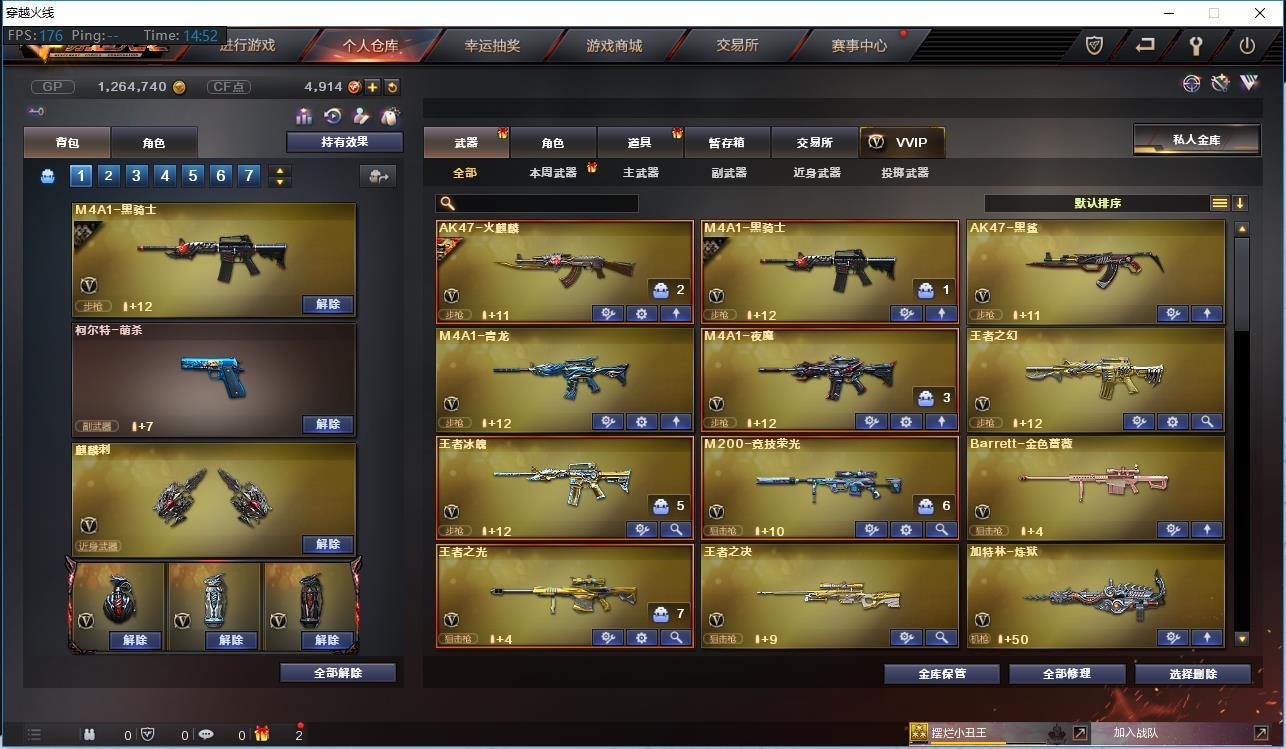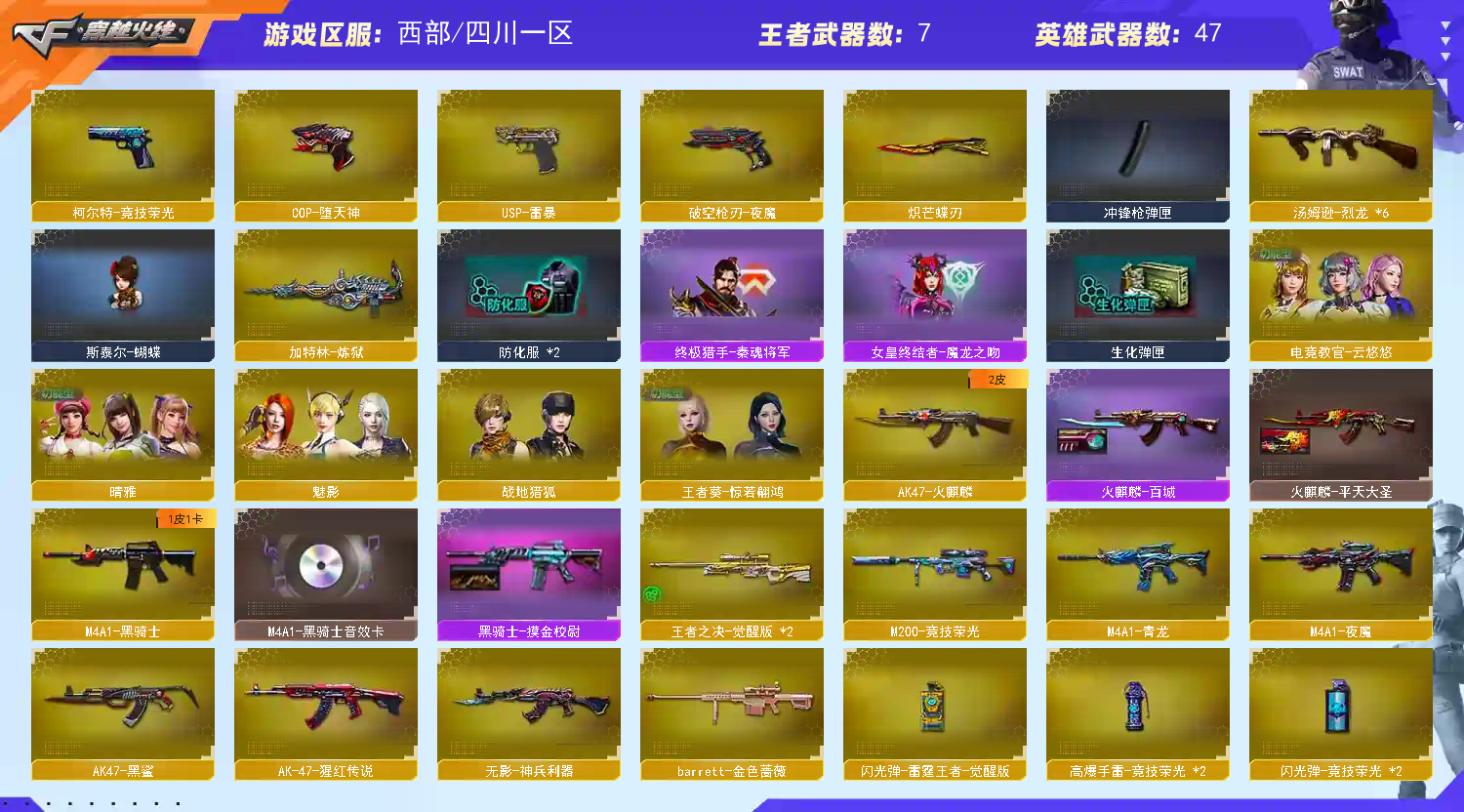 【主 武】:M200竞技荣光、5烈斯泰尔蝴蝶、王者冰魄、王者之幻、王者之光、王者之决X2、火麒麟(百城皮肤)、黑骑士、无影、死神、黑鲨、青龙、夜魔、天龙、毁灭、极光、加特林炼狱、AA12雷霆、Barrett金色蔷薇、AK47冰龙粉碎者、AK47泰坦破坏者、激光毁灭者3、征服者超越、机甲撕裂者3、深渊巨龙咆哮3、试炼破坏者3、神罚各类活动武器