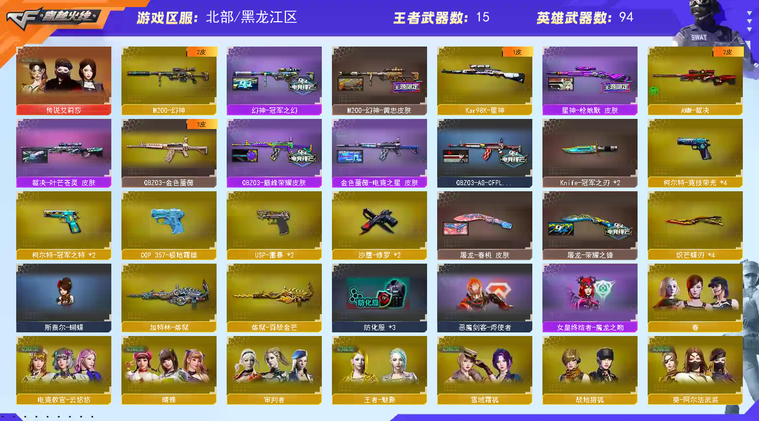 【皮肤】幻神-冠军之幻、M200-幻神-黄忠皮肤、星神-枪娘默皮肤、QBZ03-巅峰荣耀皮肤、AK47-火麒麟-传说EVEN、QBZ03-AG-CFPLS19冠军、雷神-能量核心、毁灭-直播专属、雷神-暗月、黑骑士-冠军之势、火麒麟-CF STAR、修罗-CF STAR、屠龙-荣耀之锋、雷神-荣耀之魄、黑骑士-AG-S4冠军典藏、龙啸-冠军之啸、