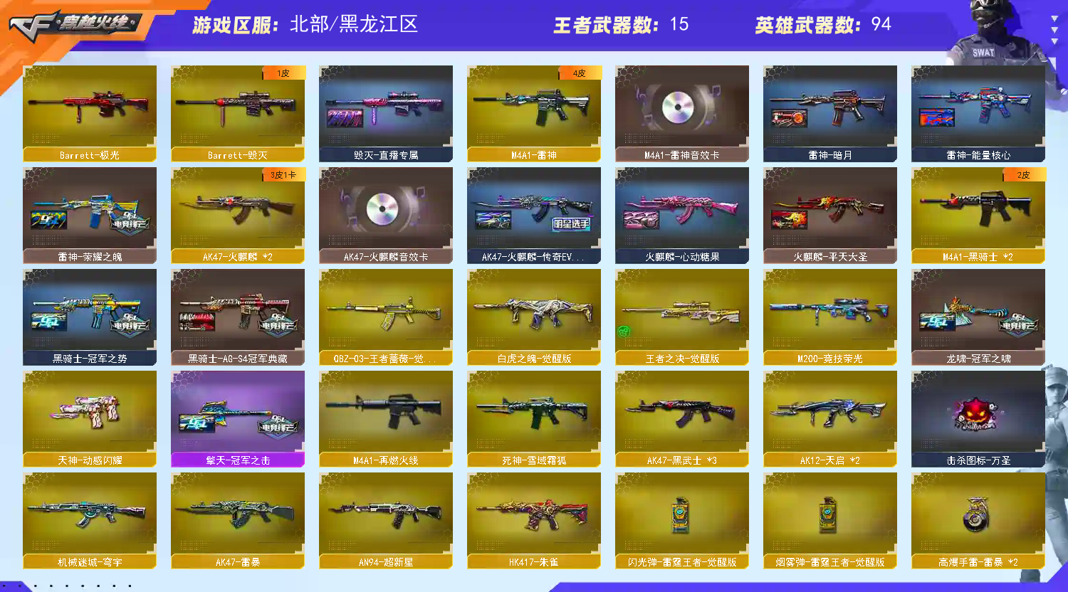 【主武】M200-幻神、M200-竞技荣光、白虎之魄、Kar98K-星神、AK47-火麒麟、M4A1-雷神、M4A1-黑骑士、AK47-黑武士、AK12-天启、AK47-雷暴、HK417-朱雀、烈火-动感闪耀、QBZ03-金色蔷薇、AWM-天龙、Barrett-毁灭、Barrett-极光、AWM-裁决、AWM-裁决-百城联赛天津、加特林-炼狱、斯泰尔-蝴蝶、王者之心、QBZ-03-王者蔷薇、王者之势、王者之决、