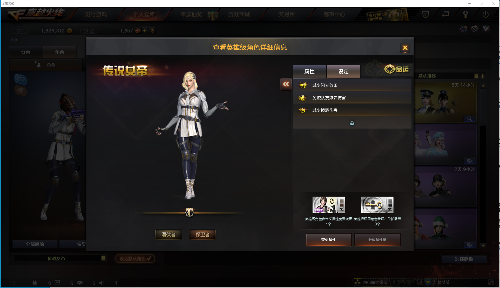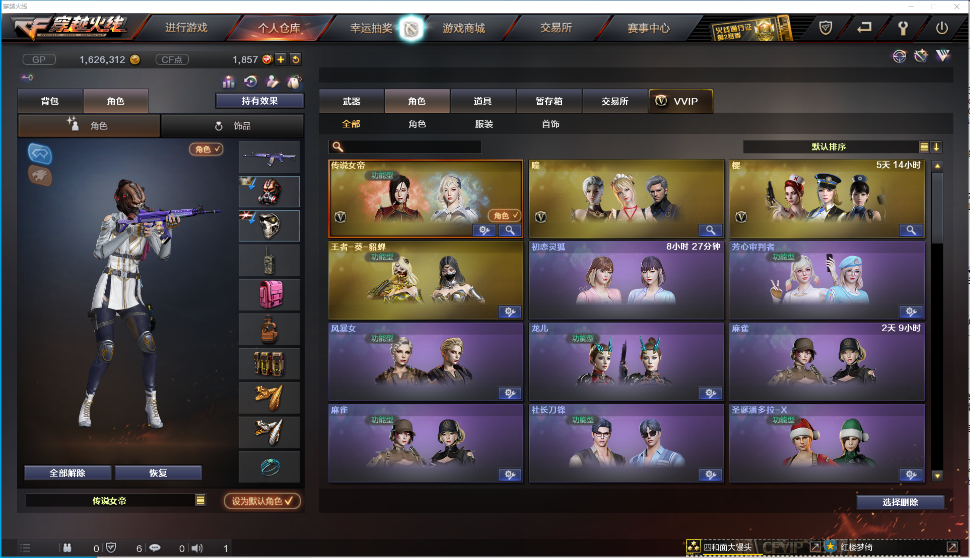 【角 色】:CFVIP2、传说女帝、瞳、王者葵貂蝉、芳心审判者、麻雀、社长刀锋、风暴女(佣兵觉醒无需换弹)、兔囡囡、圣诞潘多拉-X、超级对讲机、双龙戒指、双蛇戒指、锋芒之环