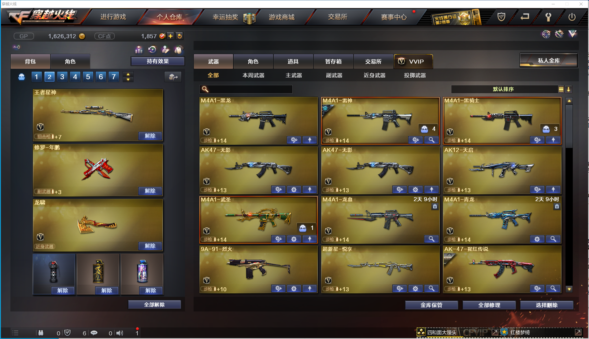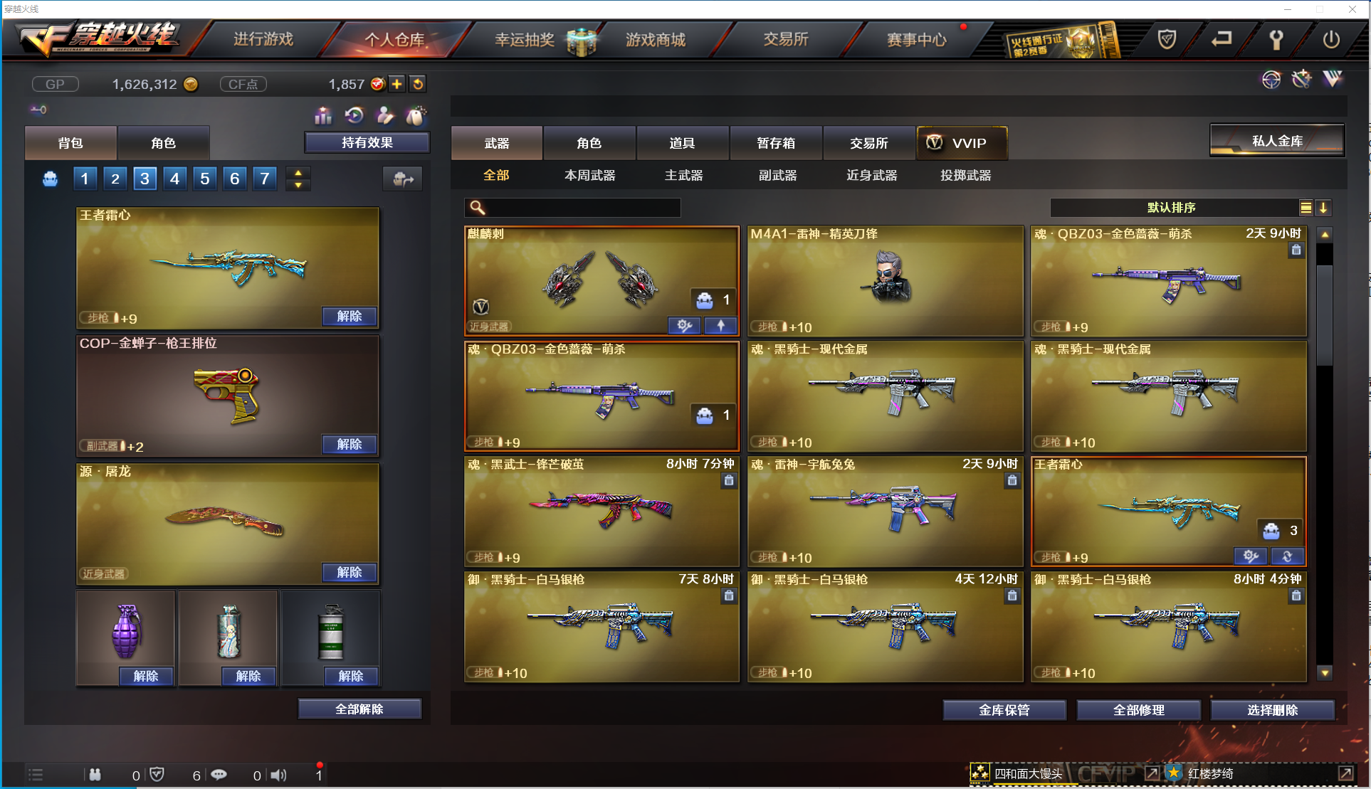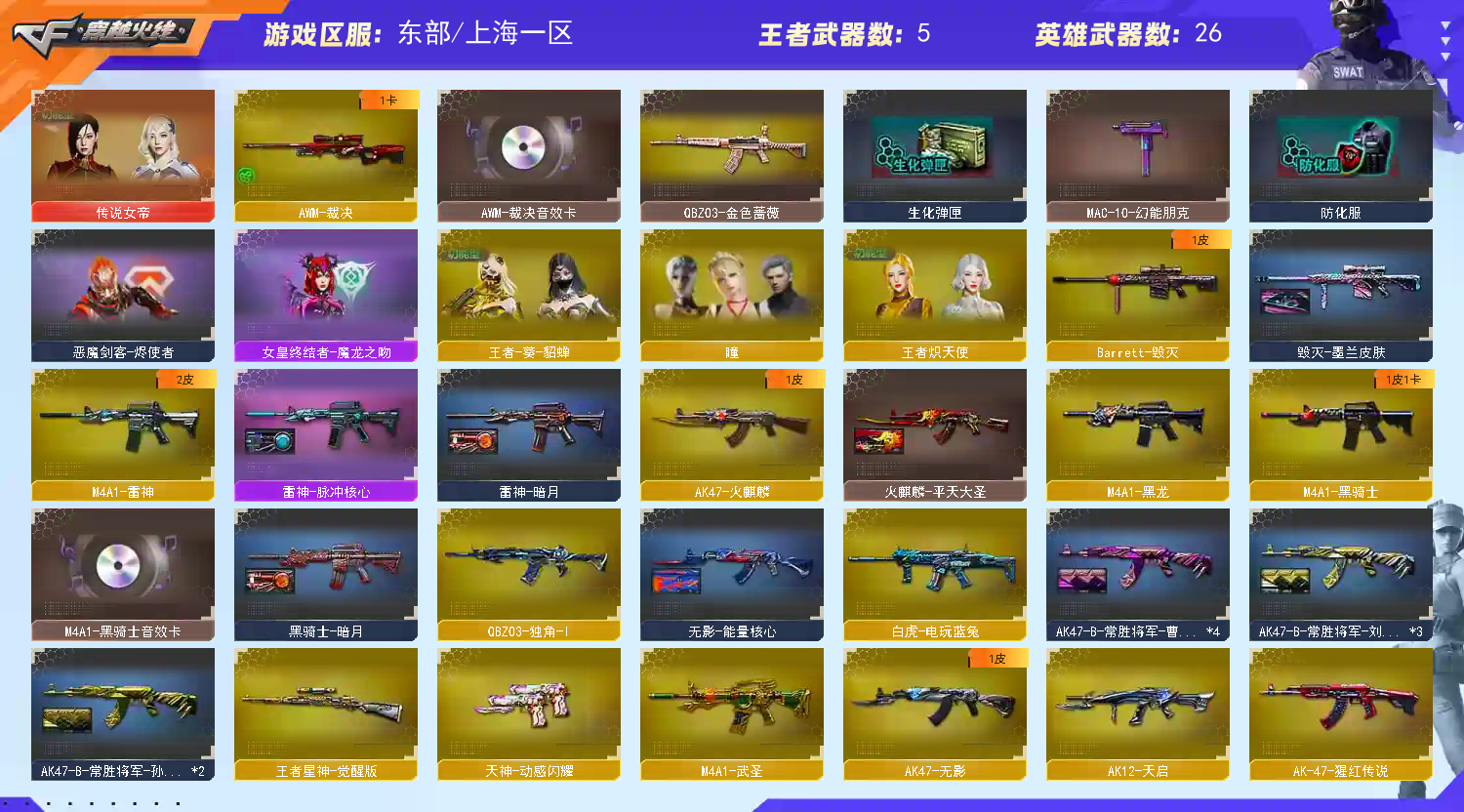 【主 武】:王者星神、王者霜心、炫金火麒麟、炫金骑士、超新星悦享、裁决、黑龙(暗月皮肤)、雷神(脉冲核心皮肤)、黑骑士、无影(能量核心)、天启、武圣、烈火、AK猩红传说、AK战神、AK常胜将军、白虎电玩蓝兔、毁灭、M4雷神刀锋、AA12雷霆、冰龙粉碎者、神圣爆裂者、试炼破坏者、金魔等各种活动武器