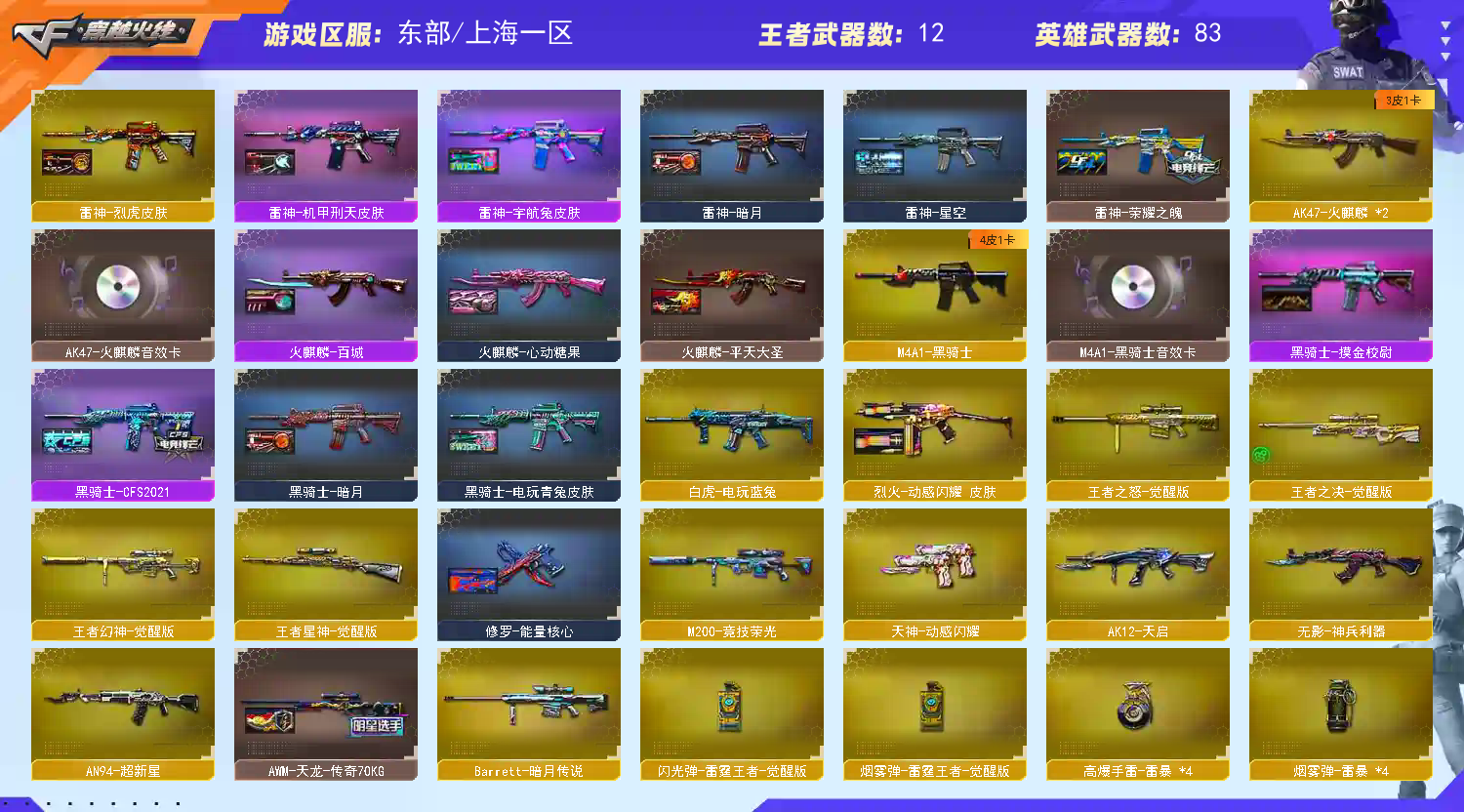 【荣耀之巅】【Lv.102 荣耀元帅】 可排位 VIP6 98V 5王者 1炫金 幻神世冠白鲨/毁灭荣耀之怒/毁灭墨兰/毁灭黑大圣/天龙传奇70KG/天龙CFSTAR/雷神荣耀之魄/雷神宇航兔/雷神暗月/雷神机甲刑天/传说女帝 炫/鹰/电竞教官-云悠悠/樱/M200-幻神/M200-竞技荣光/王者幻神-觉醒版/Barrett-毁灭/Barrett-暗月传说/竞技荣光套装/M200-幻神音效卡/M4A1-黑骑士音效卡/QBZ03-金色蔷薇音效卡/Scar Light-白虎音效卡/火麒麟音效卡/毁灭音效卡/