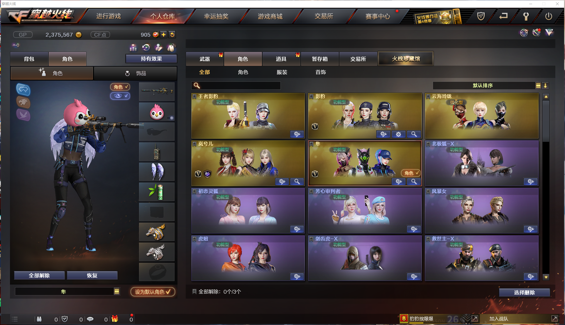 【道 具】:天使灵狐玩偶、云鲤玩偶、红色艾比玩偶、14个背包、AC(防弹衣+防弹头盔)、C4工具钳、手雷包、挑战弹夹、夺命之镰、变异宝贝、灵魂忍者、生化弹夹、防化服、机枪弹夹、冲锋枪弹夹、散弹枪弹夹、手枪弹夹、狙击枪弹夹、步枪弹夹、减少停顿包