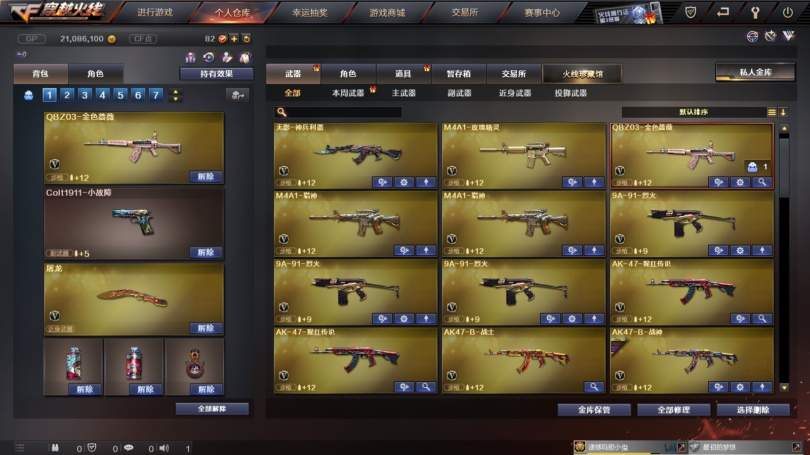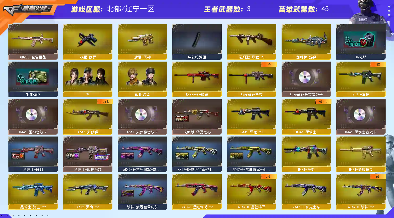 【70V】QBZ03-金色蔷薇,王者之锋,火麒麟-灵狐,炫金雷神,炫金骑士,炫金天龙,炫金天神,零,M4A1-雷神音效卡,M4A1-黑骑士音效卡,AK47-火麒麟音效卡,Barrett-毁灭音效卡,黑骑士-战神马超,火麒麟-华夏之心,火麒麟-CFSTAR,AK-B-常胜将军-刘备,AK47-B-常胜将军-曹操,AWM-天龙-传奇白鲨,AWM-天龙-传奇70KG,详情看图 【辽宁一区北部战区】