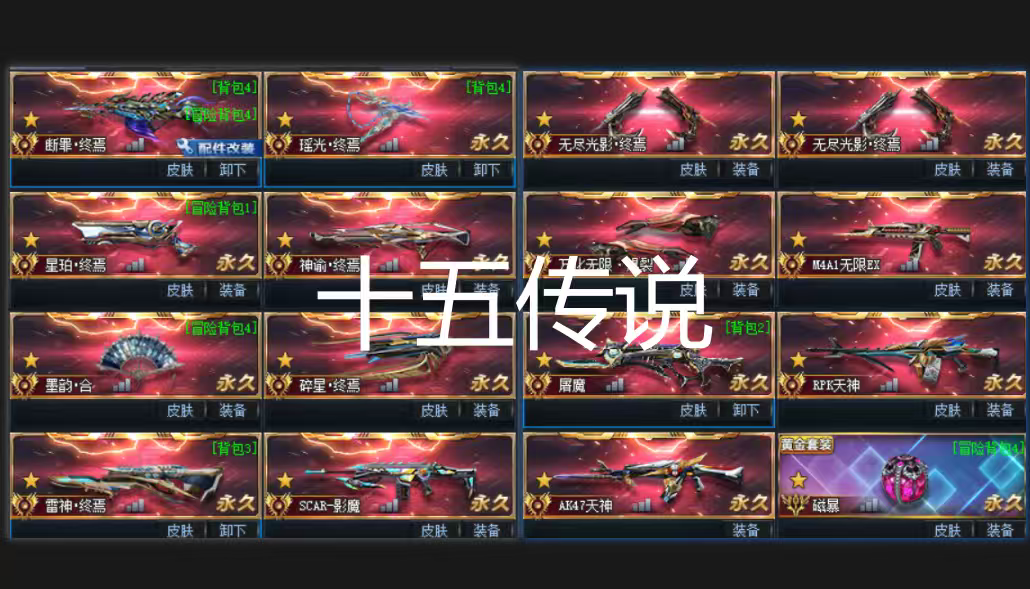 🔥十四传说(断罪终焉、瑶光终焉、神谕终焉、墨韵终焉、星珀终焉、M4A1无限EX(金蛇皮肤)、屠魔、无尽光影终焉×2、雷神终焉、碎星终焉、万化无限终焉、scar-影殇、ak天神×2、rpk天神×2)