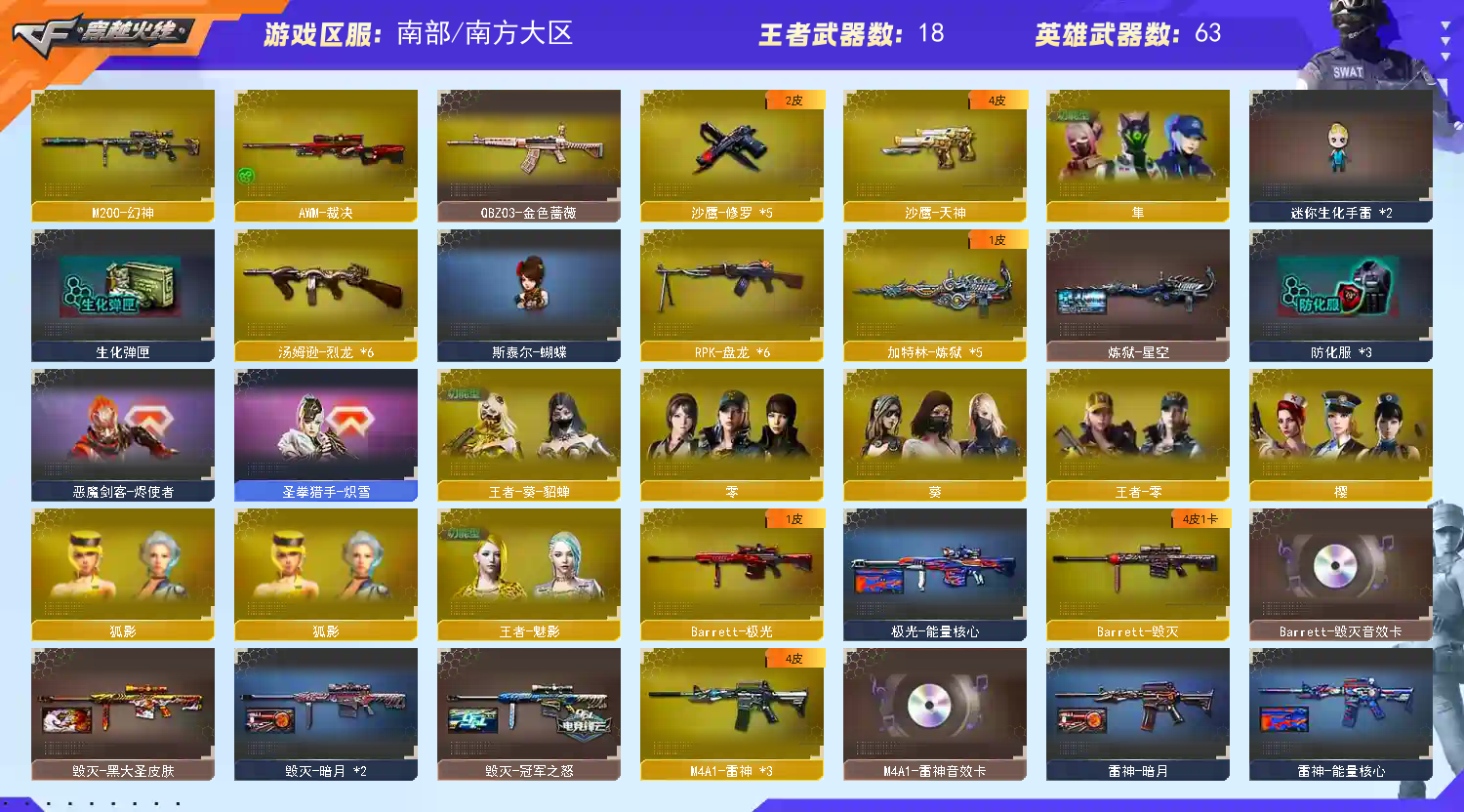 毁灭音效卡+冠军之怒皮肤,雷神音效卡+虎将皮肤,火麒麟音效卡+华夏之心皮肤,黑骑士音效卡+冠军之势皮肤,炼狱星空皮肤,爆破生化专属四防角色,爆破生化装备齐全,请文明游戏,爱护游戏环境,禁止一切开挂行为,违者后果自负!