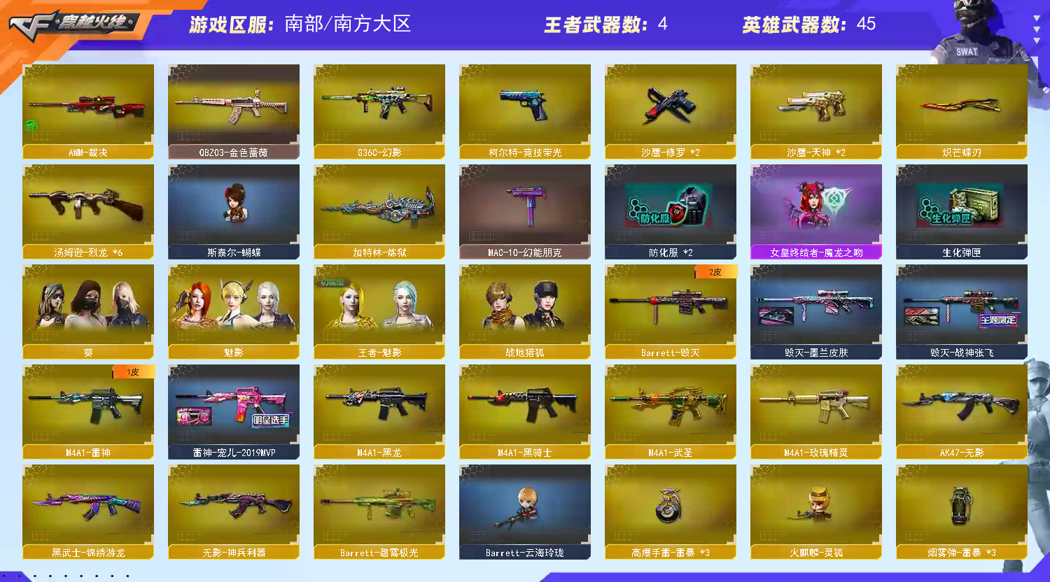 南方大区、VIP6、炽芒蝶刃+6烈龙+斯泰尔蝴蝶/G36C幻影/武圣套/可排位、QBZ03金色蔷薇、王者之势、黑龙、雷神、黑骑士、无影、王者火魄、毁灭、裁决、葵、王者魅影。魅影、