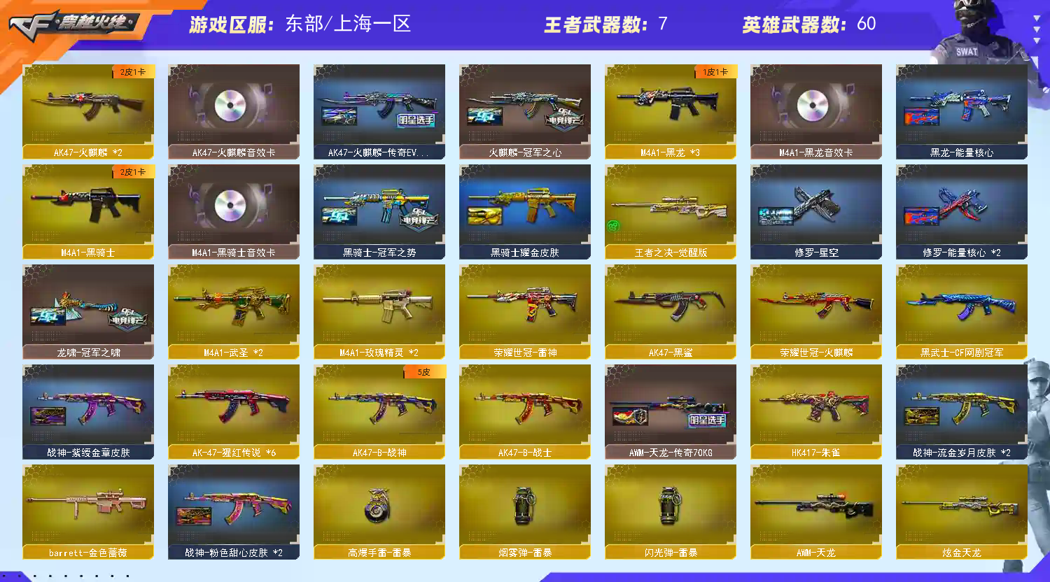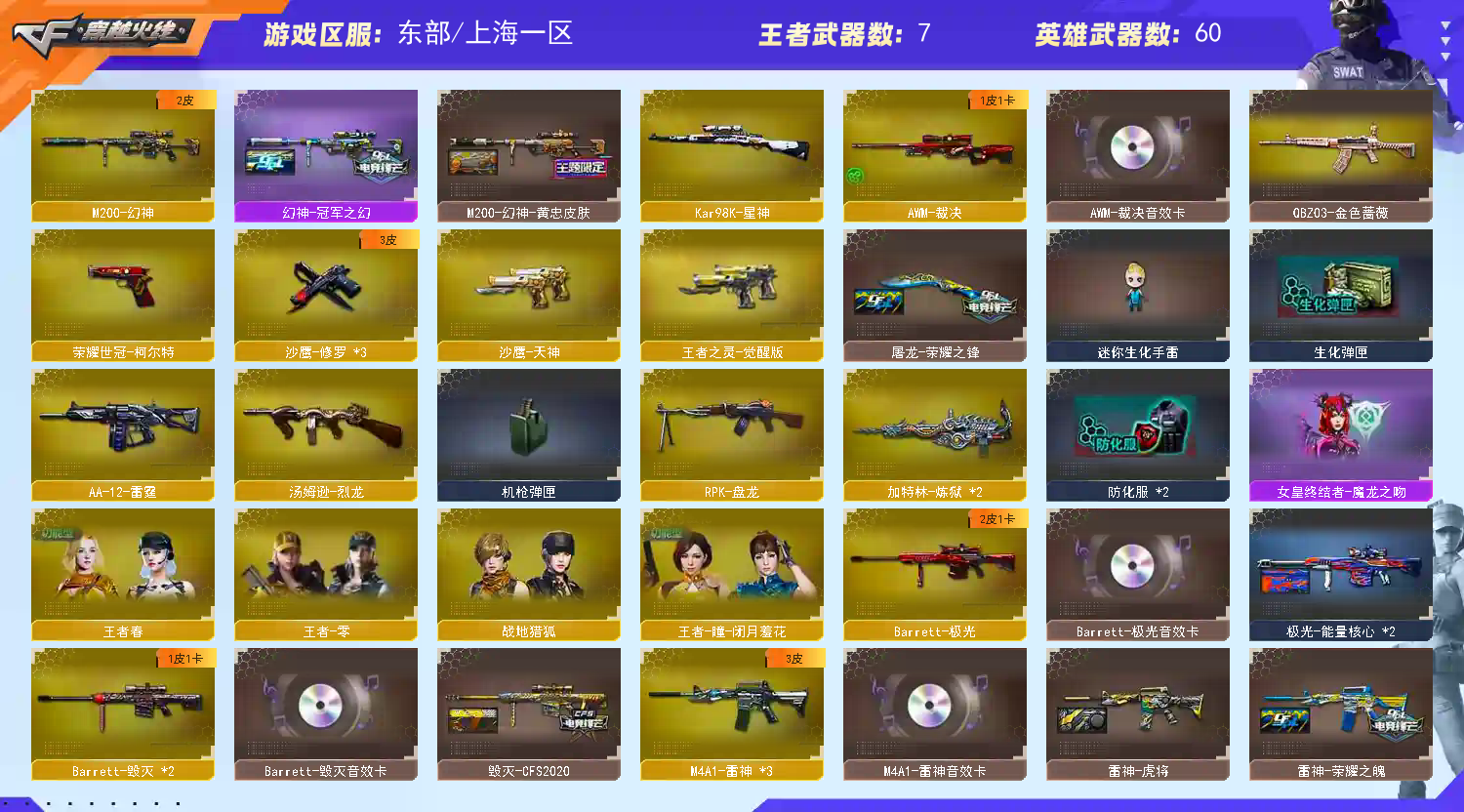 超值号/幻神+1皮/星神/全弹夹/天龙/毁灭/王者零/雷神/盘龙/金色蔷薇/生化弹夹/还有何种v武器生化弹夹四防角色等,各位手下留情开挂别来