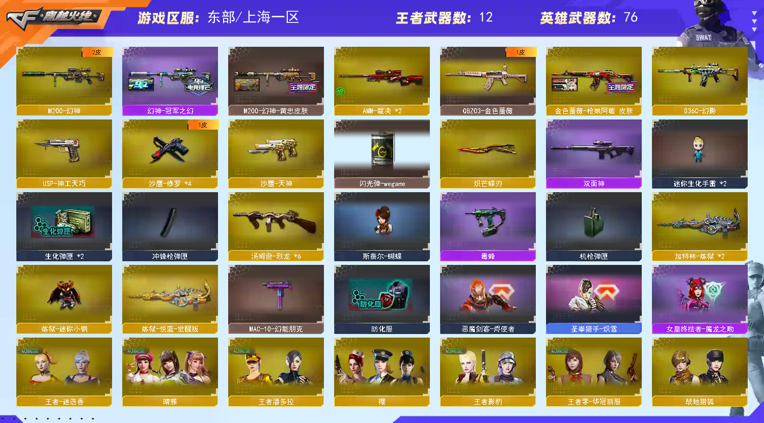 东部/晴雅/6个四防角色/幻神+2皮/6烈/斯泰尔蝴蝶/炽芒蝶刃/小艾/小刚/枪娘蔷薇/斩神刀