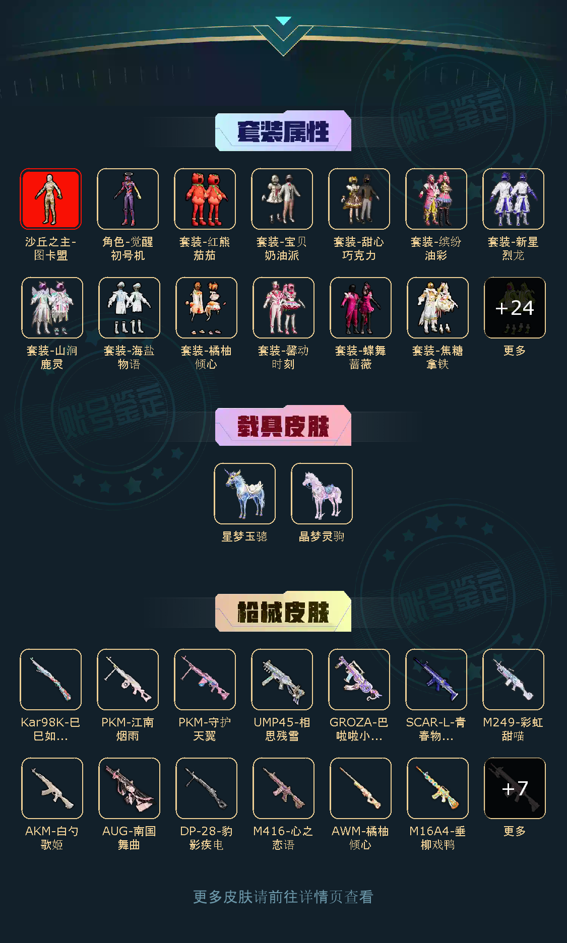 【粉色枪皮】M416-心之恋语/AKM-白勺歌姬/M16A4-垂柳戏鸭/SCAR-L-青春物语/M416-墨龙九天/GROZA-巴啦啦小魔仙/GROZA-旋转彩虹/AUG-南国舞曲/Kar98K-巳巳如意/AWM-橘柚倾心/M417-第五大道/UMP45-相思残雪/AKS-74U-信仰神谕/M249-彩虹甜喵/DP-28-千金淑猫/PKM-江南烟雨/PKM-守护天翼
