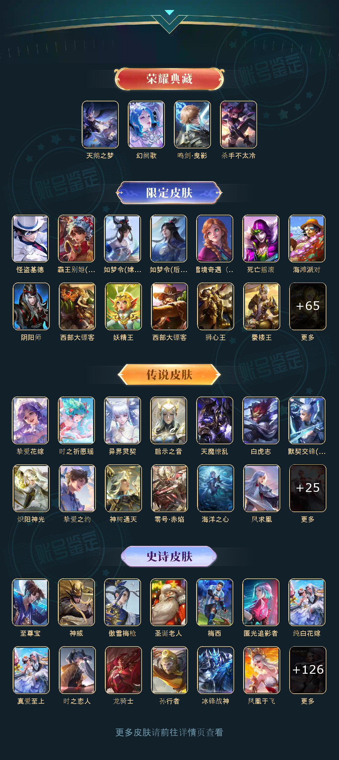 贵族等级V10,英雄数量124,典藏皮肤数4,皮肤数量425,天鹅之梦/杀手不太冷/鸣剑·曳影/启示之音