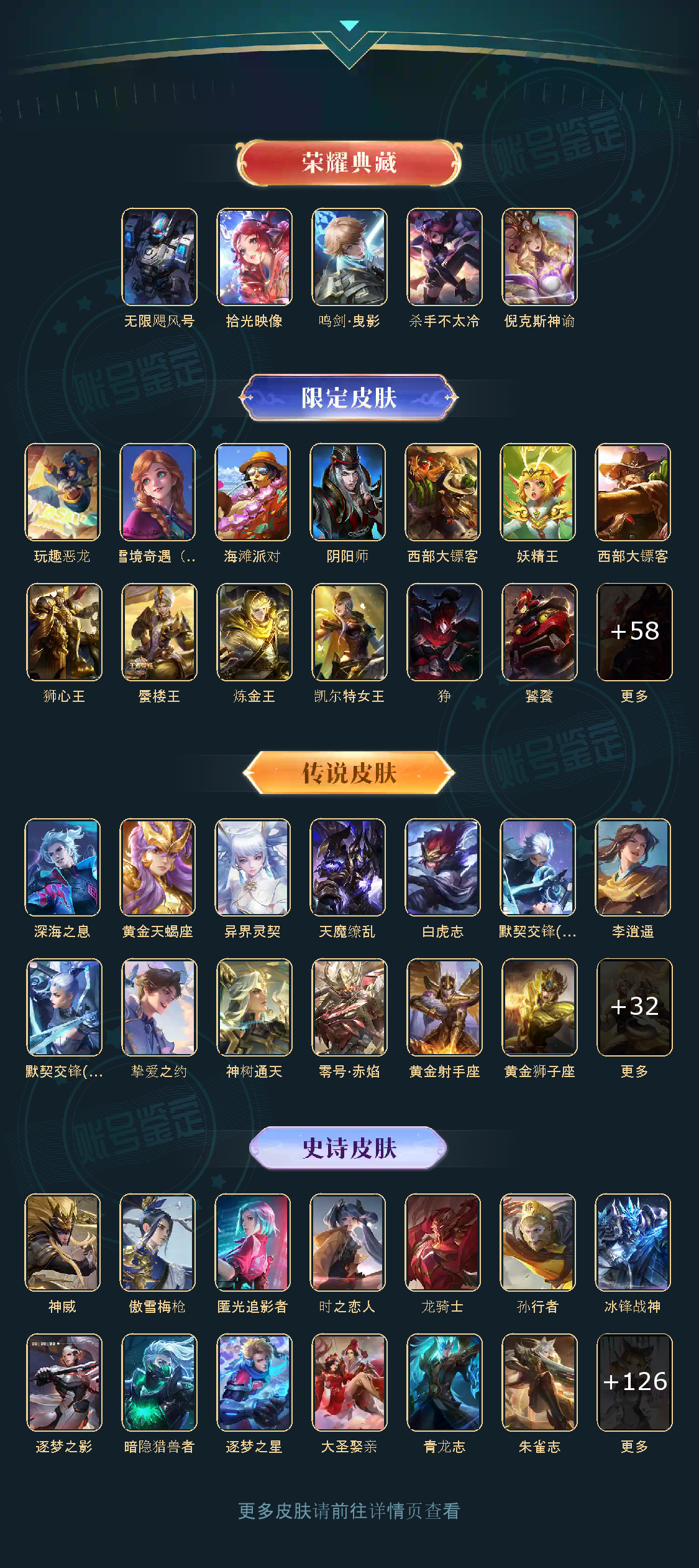 贵族等级V10,英雄数量124,典藏皮肤数5,皮肤数量424,杀手不太冷/无限飓风号/倪克斯神谕/鸣剑·曳影