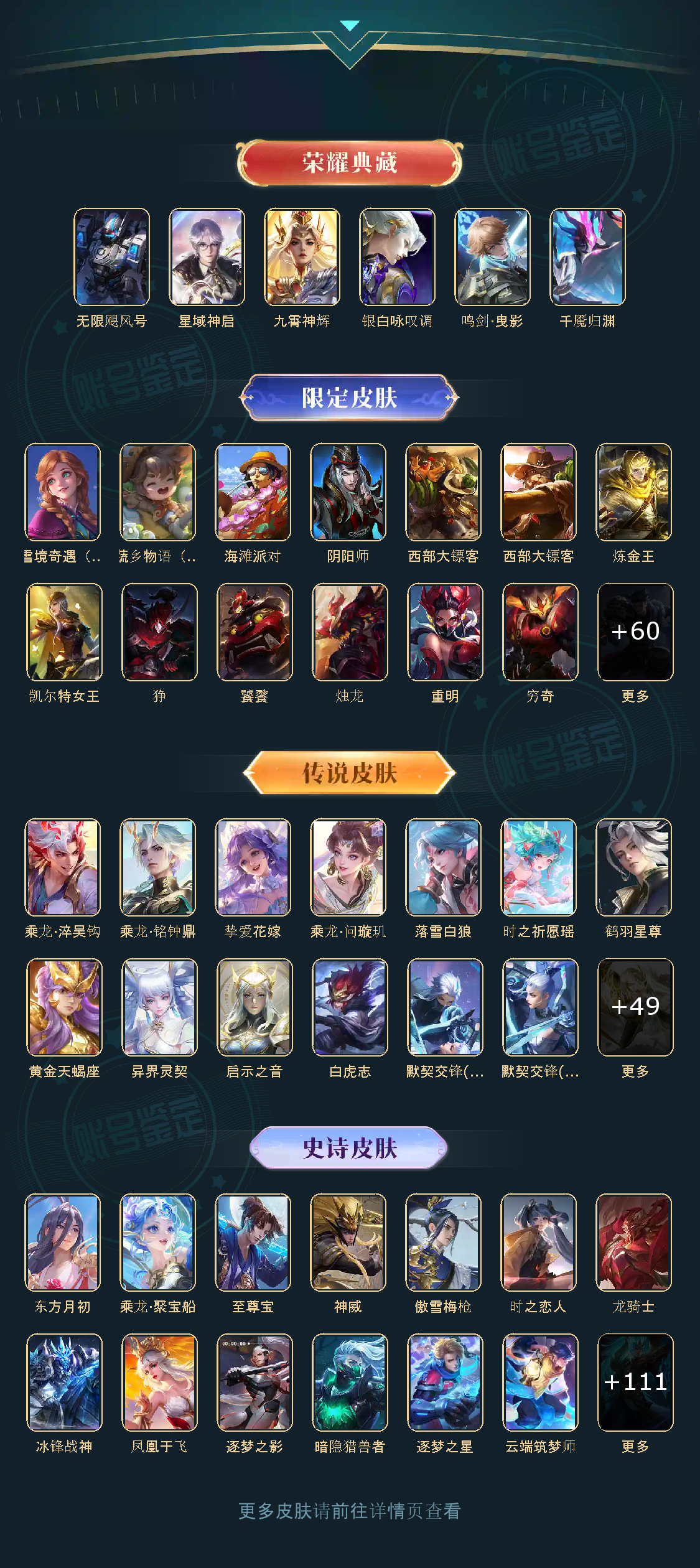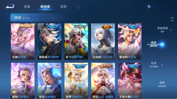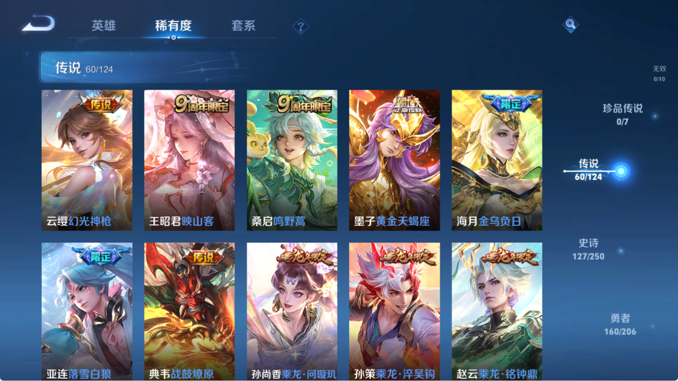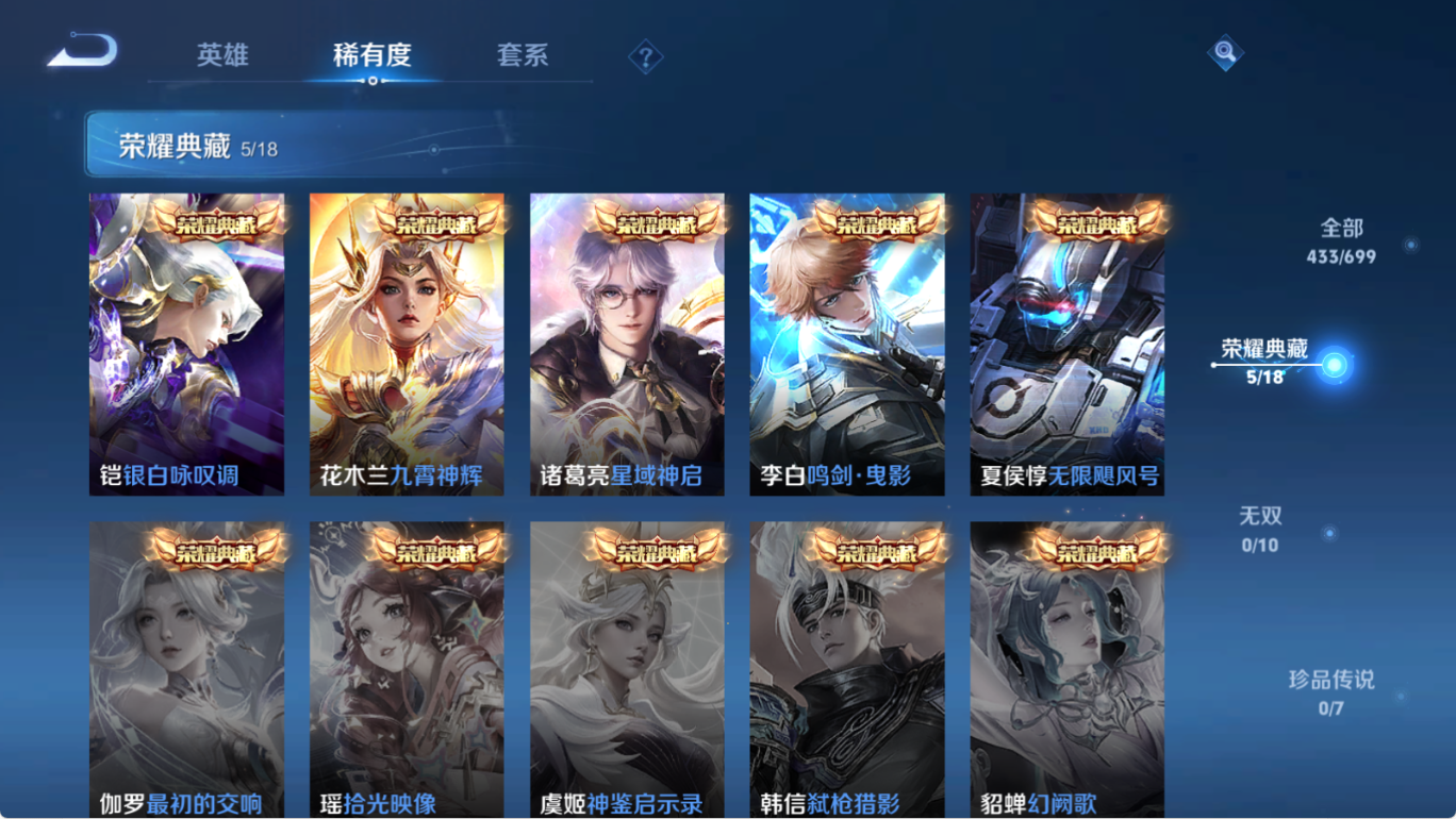 贵族等级V10,英雄数量124,典藏皮肤数5,皮肤数量433,无限飓风号/鸣剑·曳影/星域神启