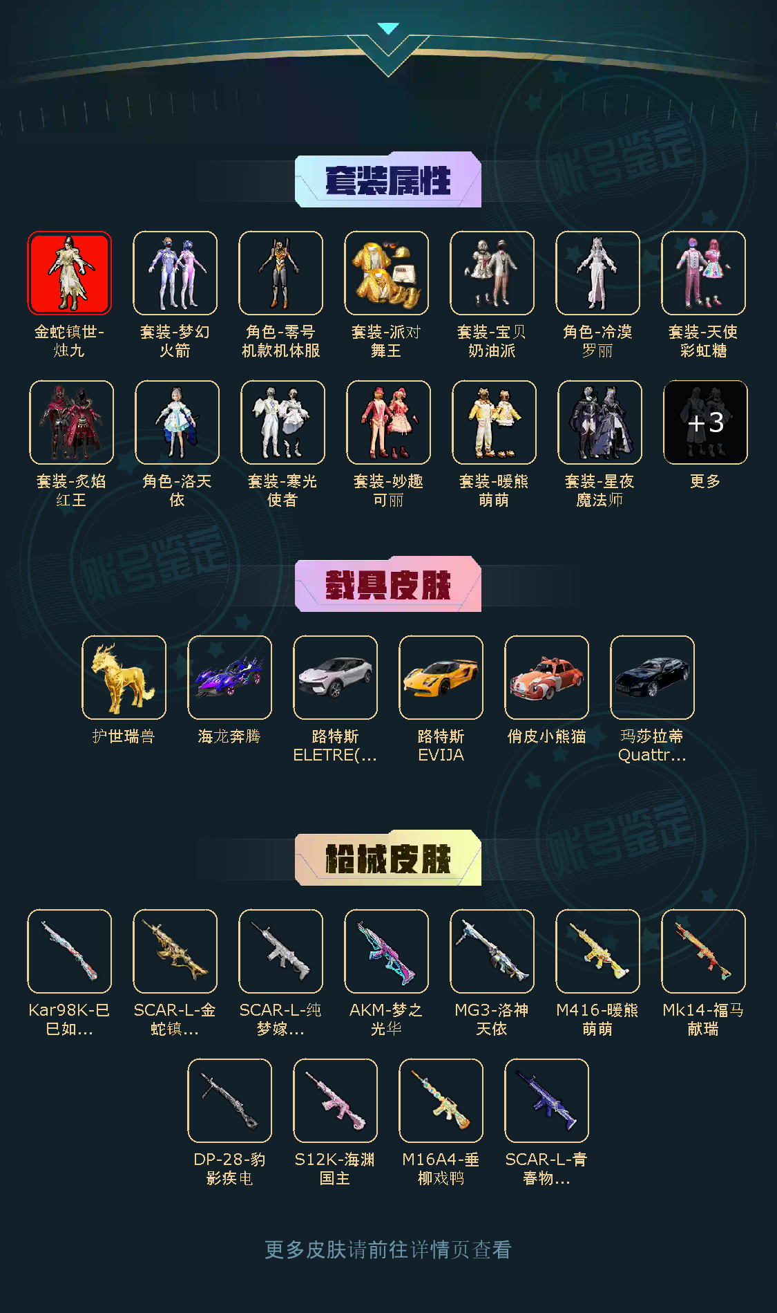 【稀有资产】金蛇镇世-烛九[1级]/角色-零号机款机体服/角色-明日香款战斗服/角色-薰款战斗服/套装-派对舞王/套装-奇异狩猎者/套装-暗夜魅影/套装-浪漫天命/套装-雪山精英/套装-暗影哥特/套装-龟仙人/套装-迅捷狂鲨/角色-俏兔智灵/套装-缤纷假日/套装-动感兔斯基人偶服