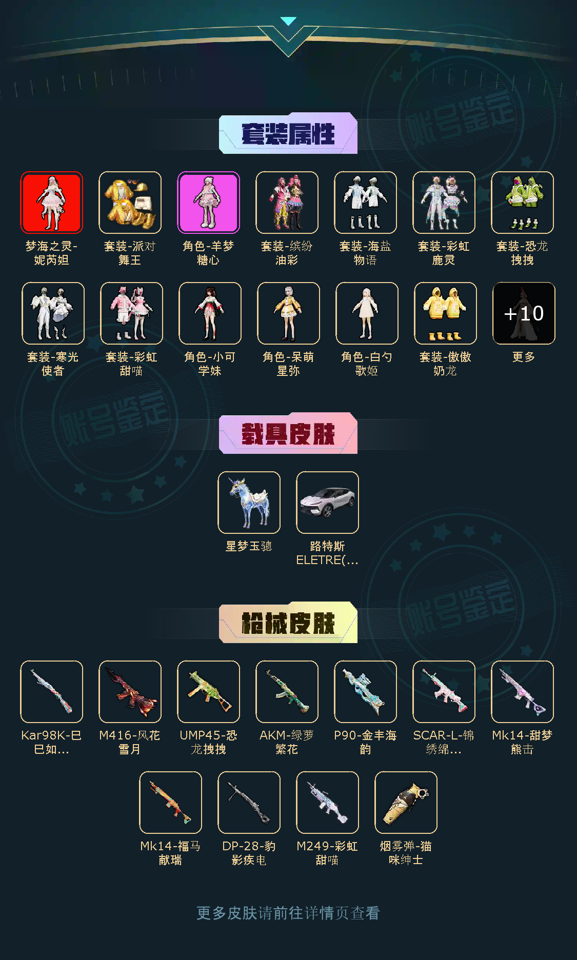 【稀有资产】梦海之灵-妮芮妲[4级]/套装-彩虹甜喵/角色-羊梦糖心/角色-严莉莉/套装-缤纷油彩/M416-风花雪月/烟雾弹-猫咪绅士/套装-派对舞王/套装-浪漫天命/套装-龟仙人/套装-软软马卡龙/套装-宝石天鹅/套装-狂沙舞者/套装-浪漫假日/套装-牛仔情诗/玩偶服-懒羊羊/角色-粉雾星云/角色-摩登魅猫