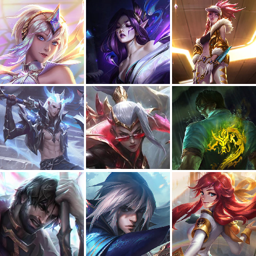 圣堂莫甘娜/殿堂传奇薇恩/创世黑夜使者亚索/幸存者杰斯/2013 SKT T1冠军套/2015 SKT T1冠军套/2016 SKT T1冠军套/SSG冠军套/IG冠军套/DRX冠军套/暗杀星冠军套/FPX冠军套/SSW冠军套/FNC冠军套/EDG冠军套