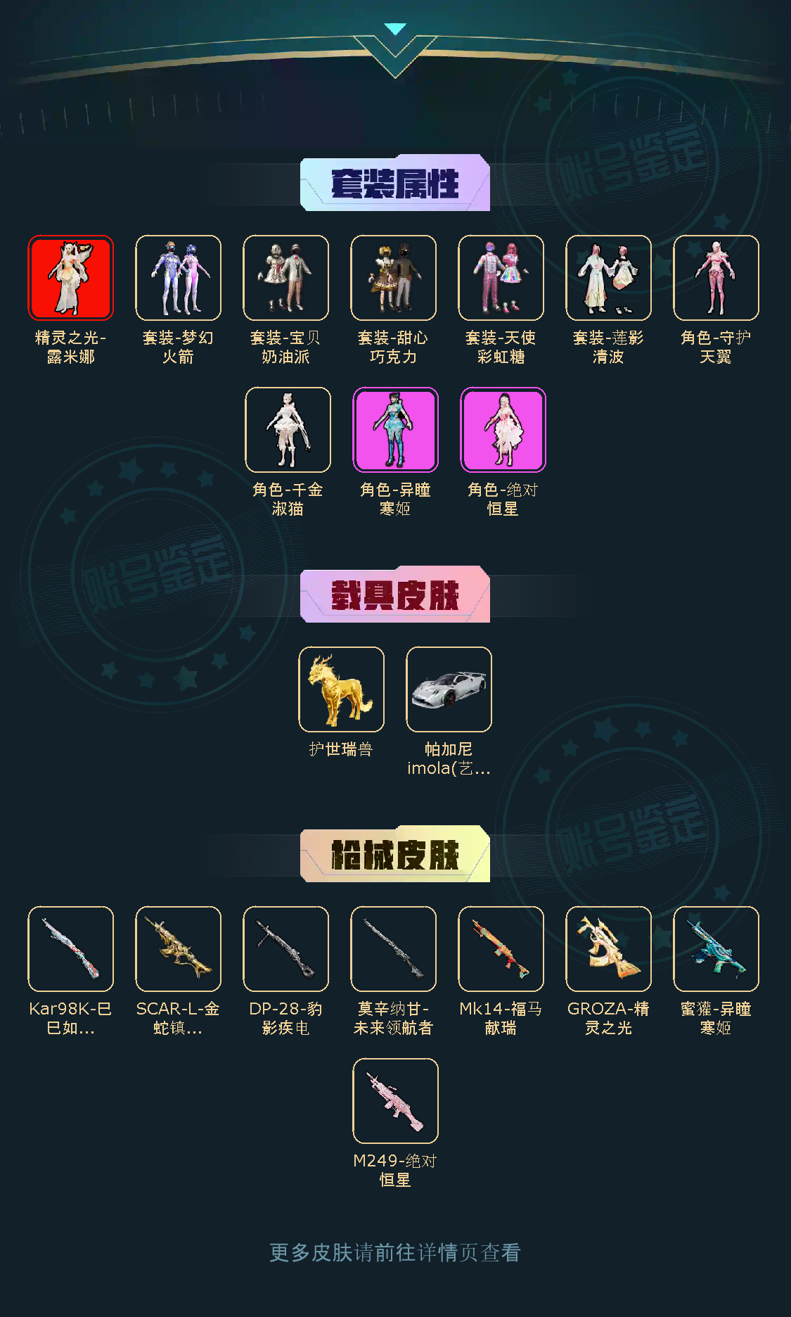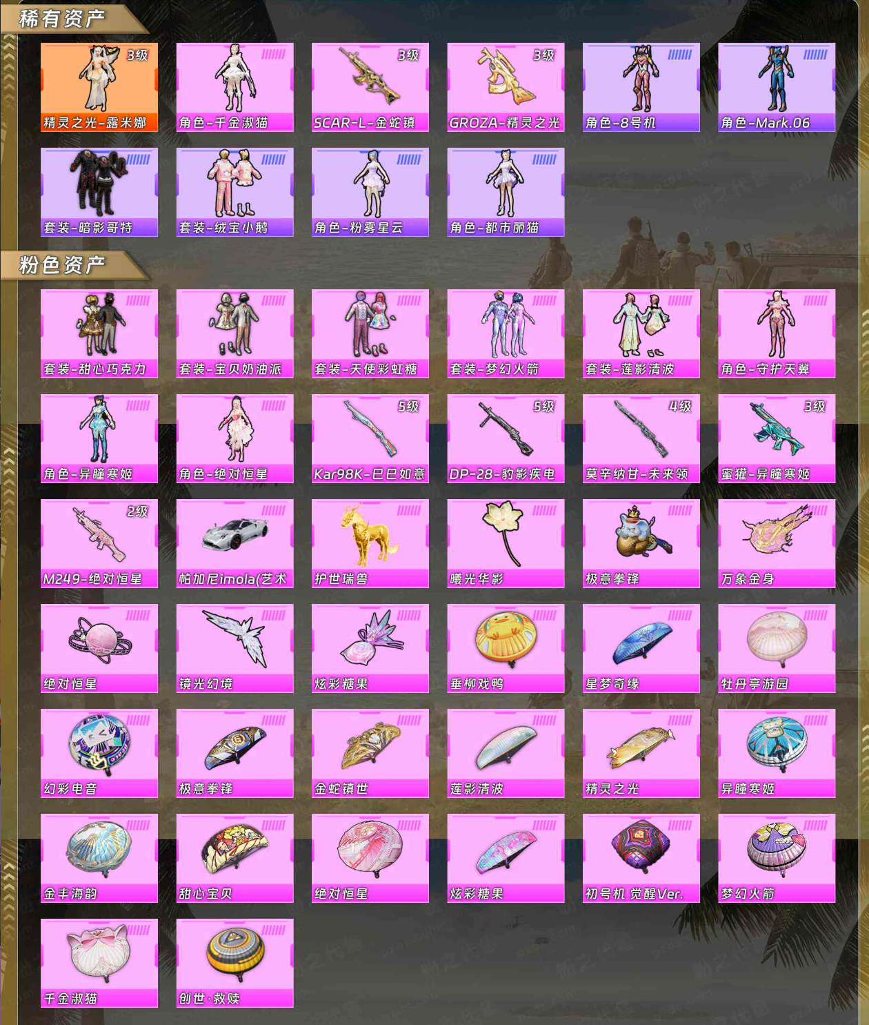 【稀有资产】精灵之光-露米娜[3级]/角色-千金淑猫/SCAR-L-金蛇镇世/GROZA-精灵之光/角色-8号机/角色-Mark.06/套装-暗影哥特/套装-绒宝小鹅/角色-粉雾星云/角色-都市丽猫